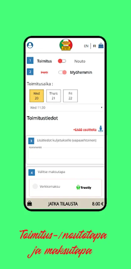 Sovelluksessa sinulla on mahdollisuus valita erilaiset maksutavat. Meillä on käytössä: