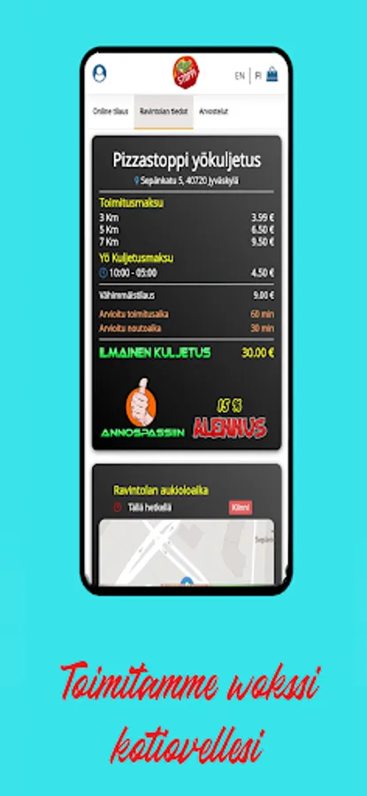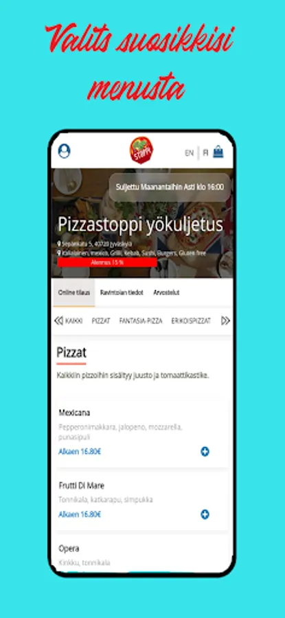 In the Pizzastoppi Yokuljetus application, you can find all the restaurant's selections cheaply and with the best offers! You can order in advance, pick up at a restaurant or enjoy at home. With the help of the application, the best help can be found for every situation.