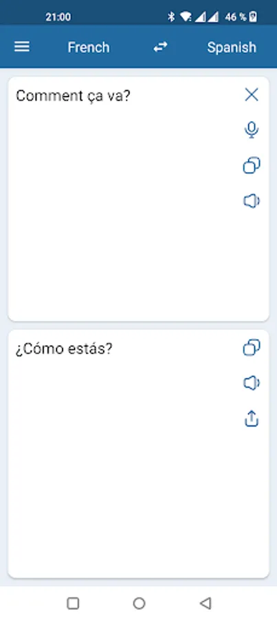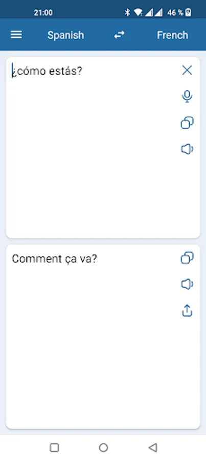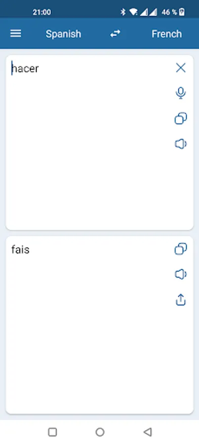 This app is able to translate words and text from French to Spanish, and from Spanish to French.