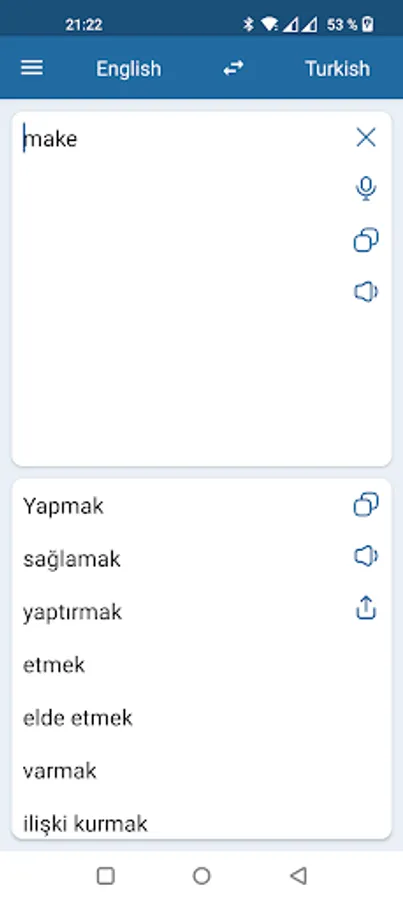 This app is able to translate words and text from Turkish to English, and from English to Turkish.