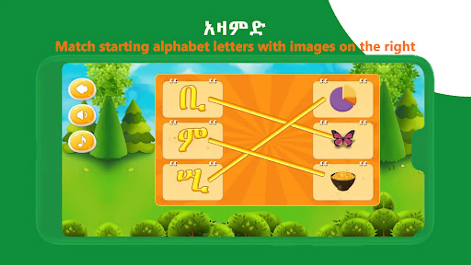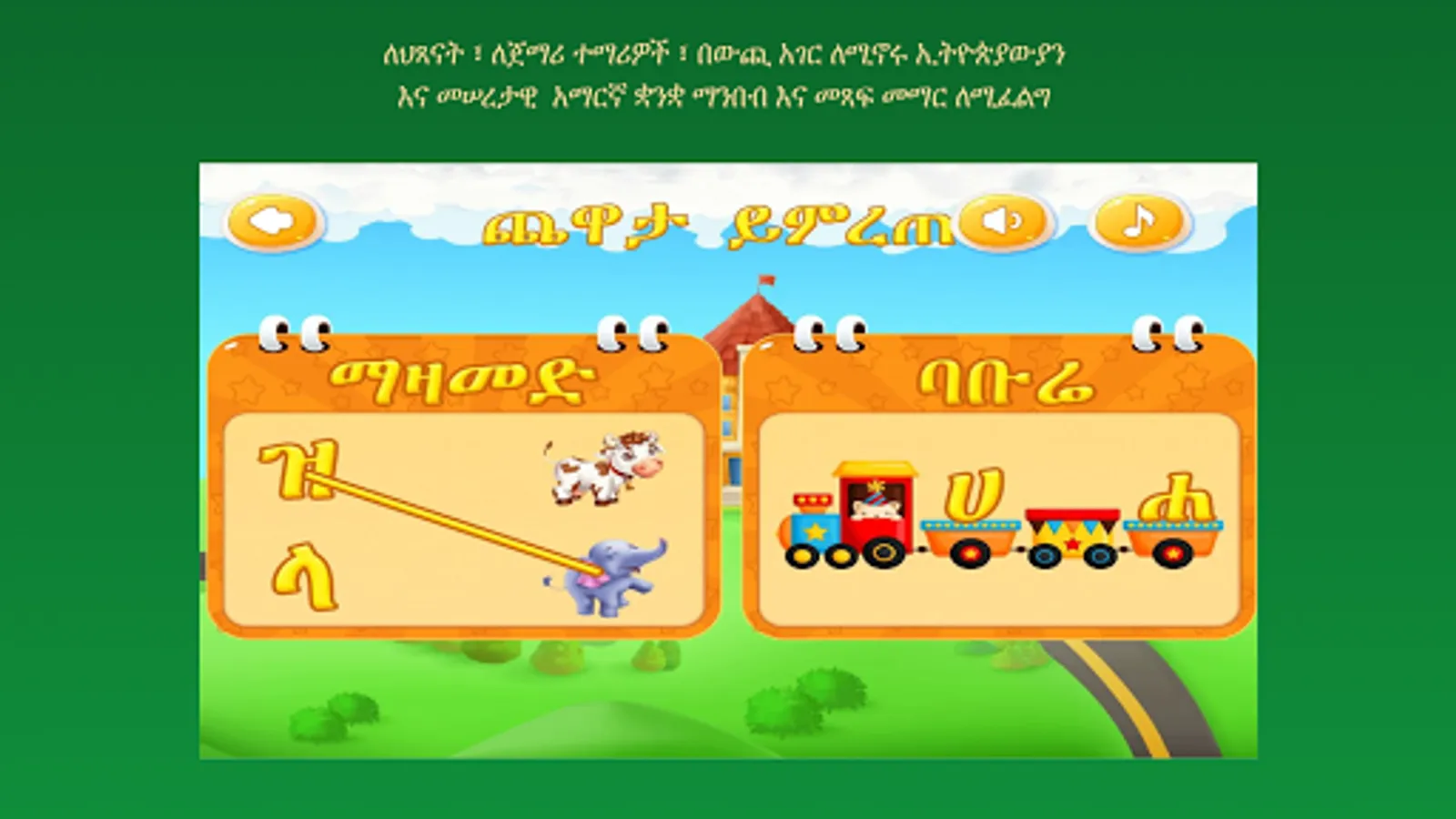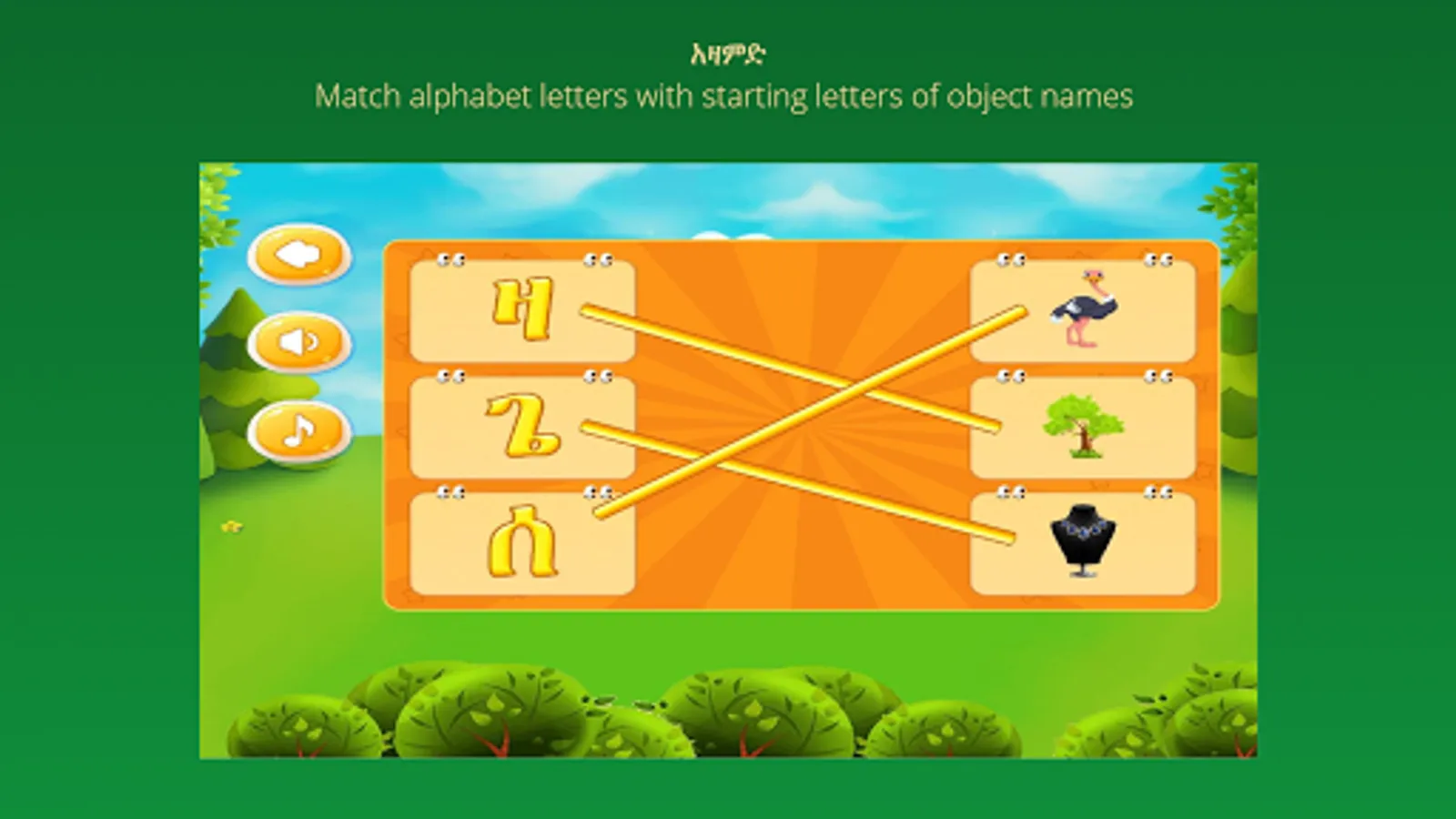 3. አዛምድ፤ በጨዋታው በግራ በኩል ያሉ ፊደላት በቀኝ በኩል የተመለከቱ ቃላት (እቃዎች፣ እንሰሳት ፣ ስም ፣ .ወዘተ) የመጀመሪያ ፊደል ሲሆኑ ትክክል የሆኑትን በመለየት በመስመር ያገናኙ። ይህ ጨዋታ ፊደላትን ለመለየት፣ ቃላትን ለመለየት ብሎም የቃላትን የመጀመሪያ ፊደላትን ለመለየት ያግዛል። መልሶቹን ከቃላት ወደ ፊደላት ወይም ከፊደላት ወደ ቃላት መስመር በማስመር ማገናኘት ይቻላል። በጨዋታው የሚታዩ ምስሎችን በመጫን በትክክል የሚወክሉትን ቃል በድምጽ መስማት ይቻላል።