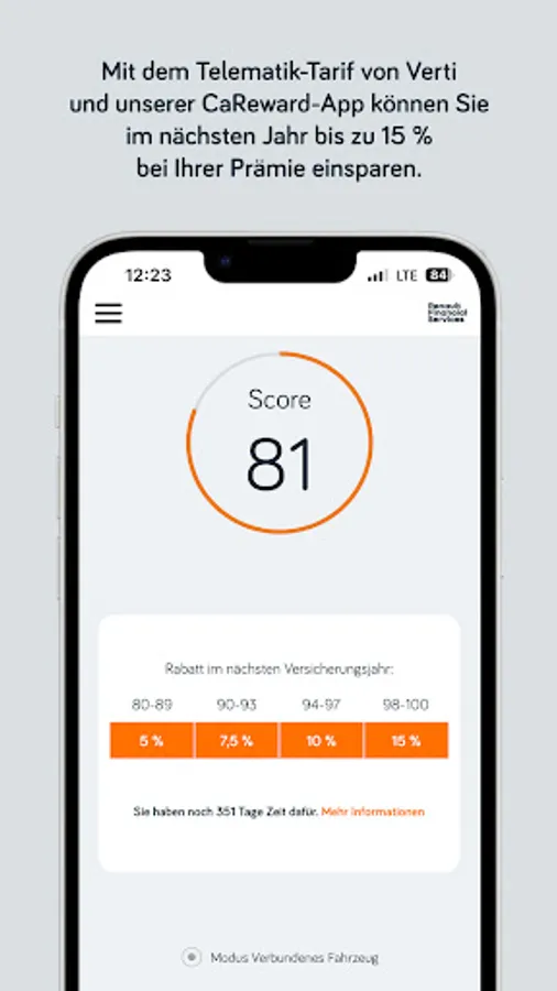 With CaReward, the telematics app for Verti policyholders, drivers can evaluate their driving behavior and thus save significantly on their car insurance. The prerequisite for using the app is the telematics module from Verti Versicherung and the use of a vehicle that is able to record vehicle data.