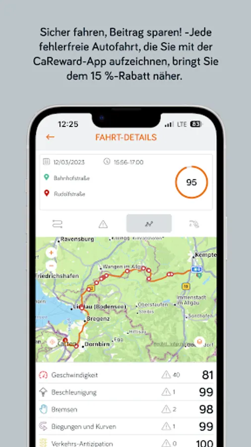 After you have registered in the app, it records your journeys, recognizes potential for optimization and awards points for your driving behavior. Depending on the number of points achieved and your mileage, you can benefit from lower insurance premiums. A deterioration/upgrading of your insurance tariff is of course excluded by using the app.