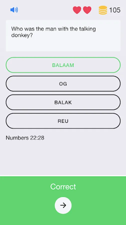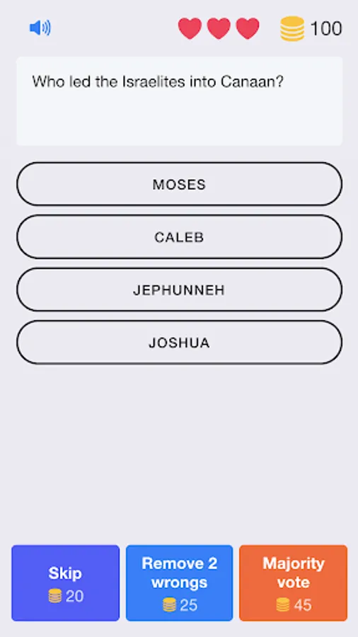 Each incorrect answer takes 1 of your 3 lives. You lose the game after you lose all 3 lives and then your points are accumulated. On the harder questions, you can use help to guess the correct answer such as Skip question, Remove 2 Wrongs, and Majority Vote. The help you will receive costs coins, which you collect by successfully completing the bible trivia challenges.