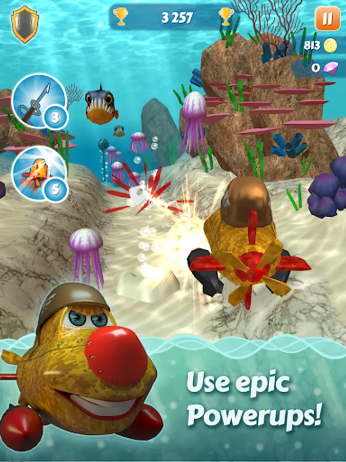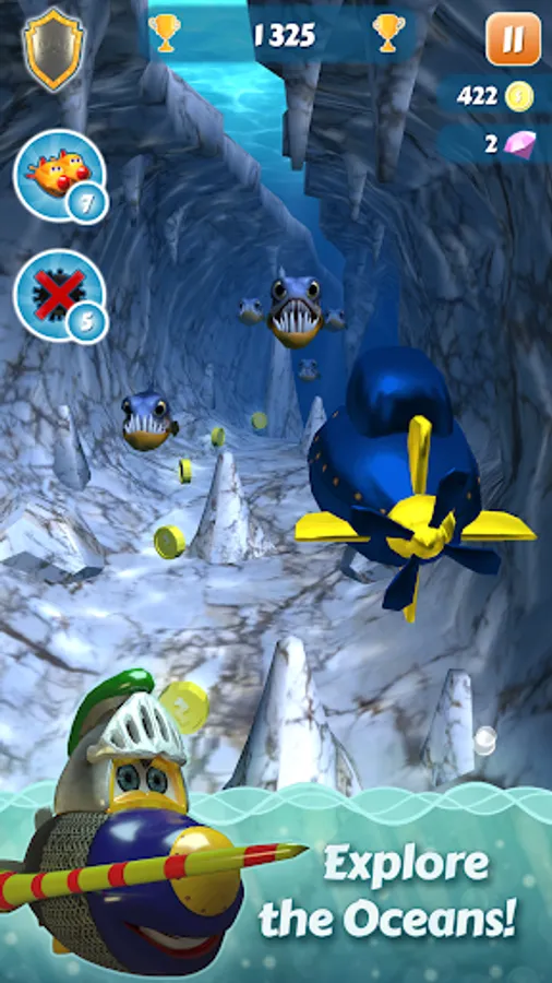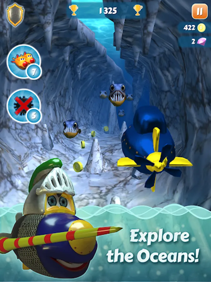 Nobody knows how many ships didn't swim to their hardboards. How many ships sunk in the wild water. And nobody knows what treasures these ships had on the board. Now you have a great opportunity to explore this deep water and find the lost treasure scattered on the sea bottom. Choose one of many little submarines adjusted for collecting treasures from the ocean and start your journey. However, be careful because the ocean is not the safest place on earth, especially for a small submarine. There is a lot of danger all around from sharp reefs and forgotten underwater mines to big creatures defending their territory. But the rewards are worth it. When you have sufficient amount of collected coins and gems, You can use it to improve your submarine and unlock new sea areas.