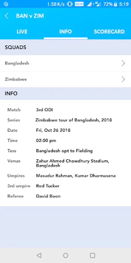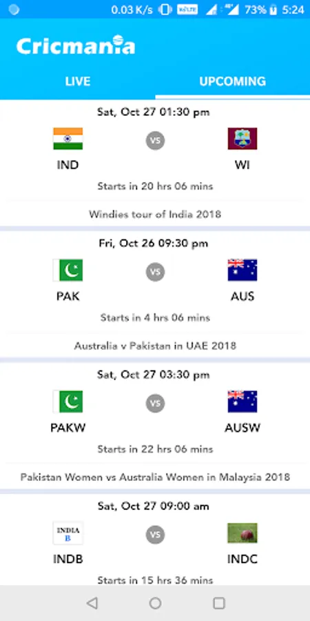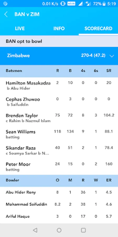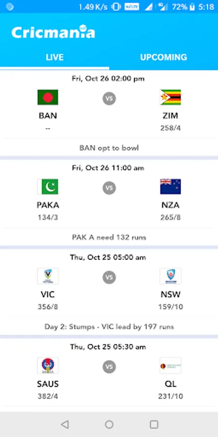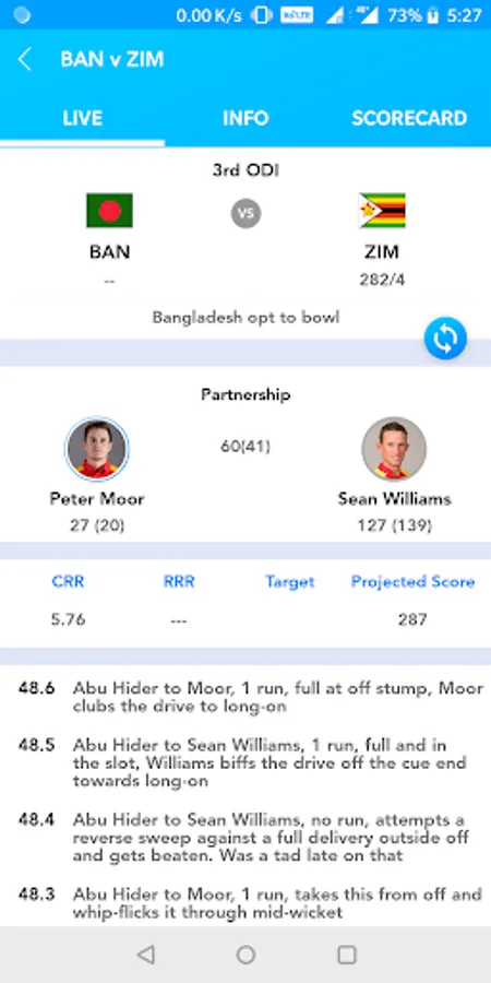 Get the complete information of a cricket match like the scorecard, ball to ball live score , live score updates, and recent updates of a match. You can even have a quick look at the match schedules, and other important information related to match.