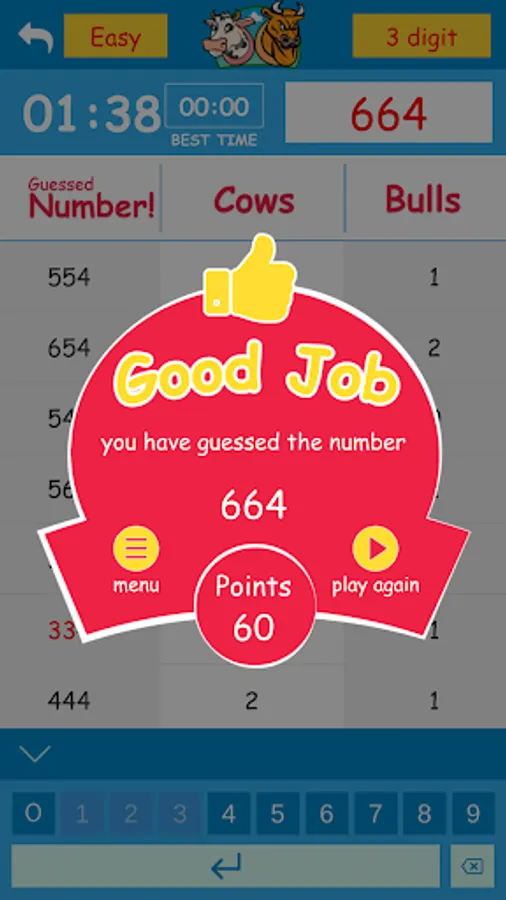 For example, if the secret number is 1234, and the first guessed number is 5678 would result in "0 Cows, 0 Bulls" (since all the guessed digits are not in the secret number). If the guessed number is 4567 it would result in "1 Cows, 0 Bulls" (since 4 is present, but not in the exact position), and if the guessed number is 8214 it would result in "1 Cows, 2 Bulls" (since 2 and 4 are in the right positions, while 1 is in the wrong position). The game would continue until you guess the right number with "4 Bulls".