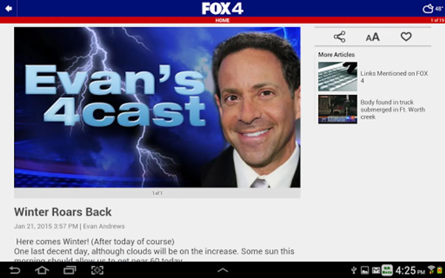 Take FOX 4 news everywhere you go! Our app connects you with top stories in the North Texas area— complete with breaking news alerts, live video, and real-time weather forecasts.