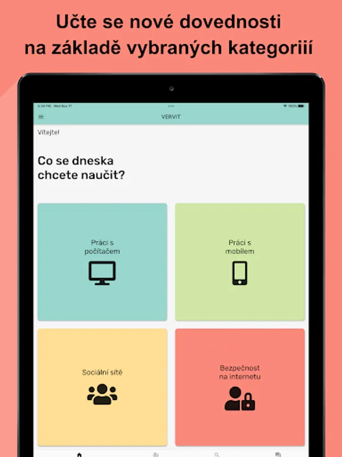 On the "Home" page, you can go through the signposts to the specifically targeted videos on the topic you are looking for. The main categories are working with a computer and working with a mobile phone. We are also preparing two more categories of videos for you, which will be available in future versions of the application: social networks and internet security.