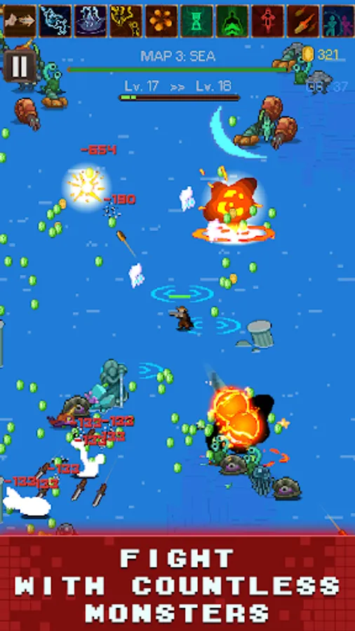 - Select items to increase combat power: Armor, Max Health, Area, Velocity...