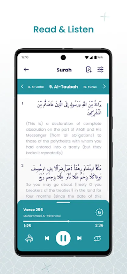 - Listen to 10 different recitations, including English and Arabic (stream or download for offline mode)