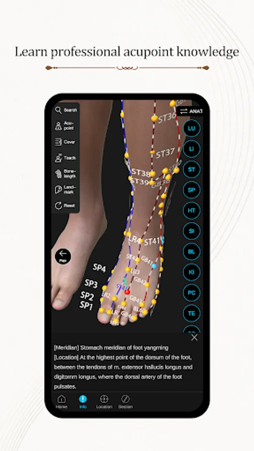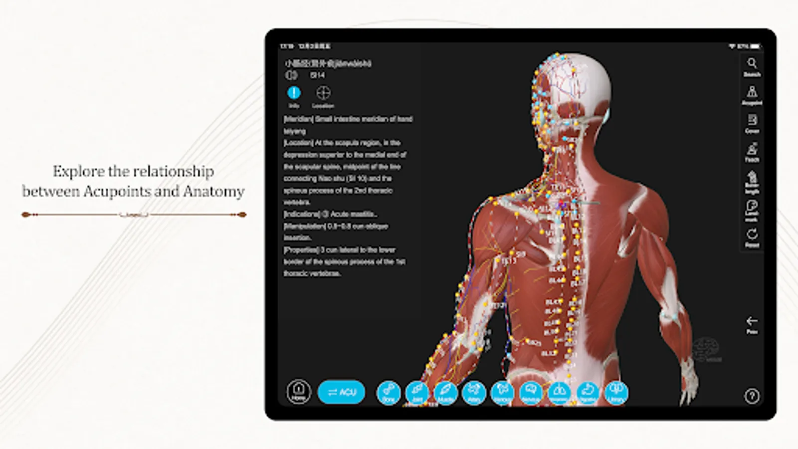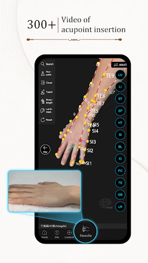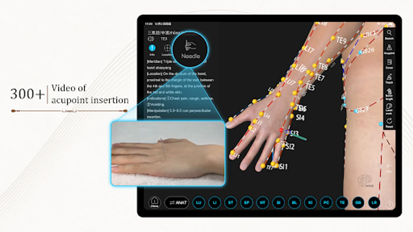 3. On the basis of Meridians and Acupoints, it supports the use of anatomical structures such as bone, muscle, nerve, artery, vein and lymph. For important Acupoints used, demonstration videos of positioning and needling are provided.