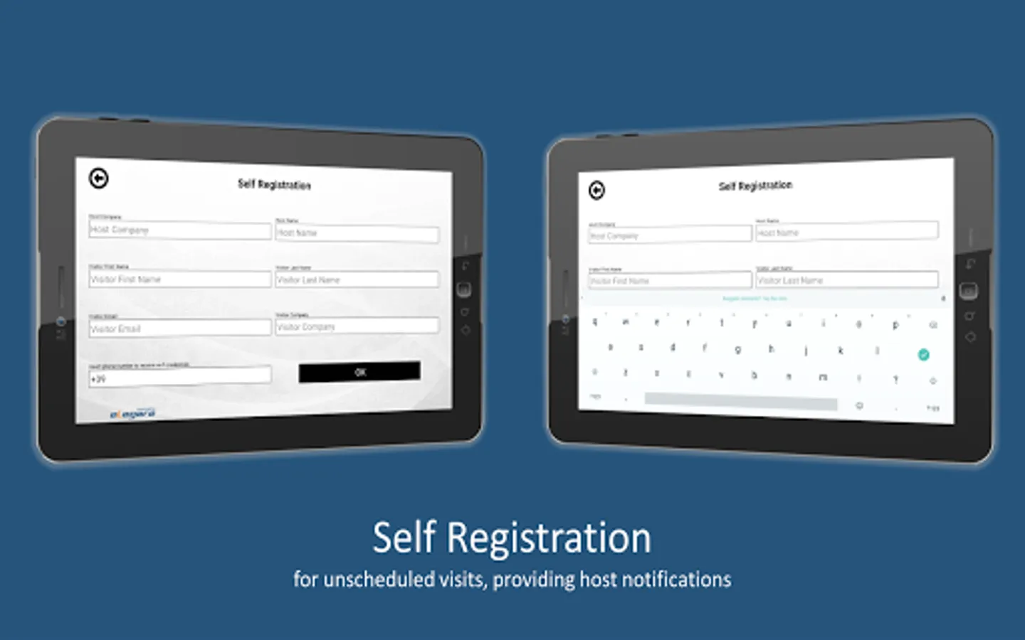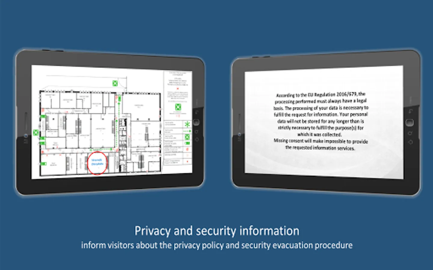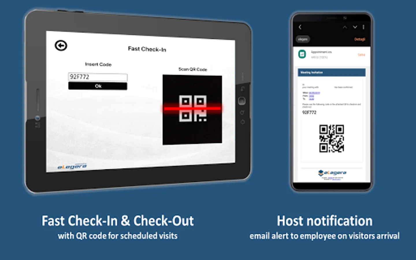 eSVM Kiosk App receives the visitors at the entrance creating a personal guest welcoming experience providing privacy and security information and welcome messages. The user-friendly interface allows a fast scan of the QR code for check-in and check-out operations and unscheduled visits pre-registration: a visitor arriving at the reception without an invitation can use the Kiosk App to register his personal data and notify host and receptionist of the request. Graphics elements like images, logos and backgrounds in addition to text messages are customizable to improve guest experience.