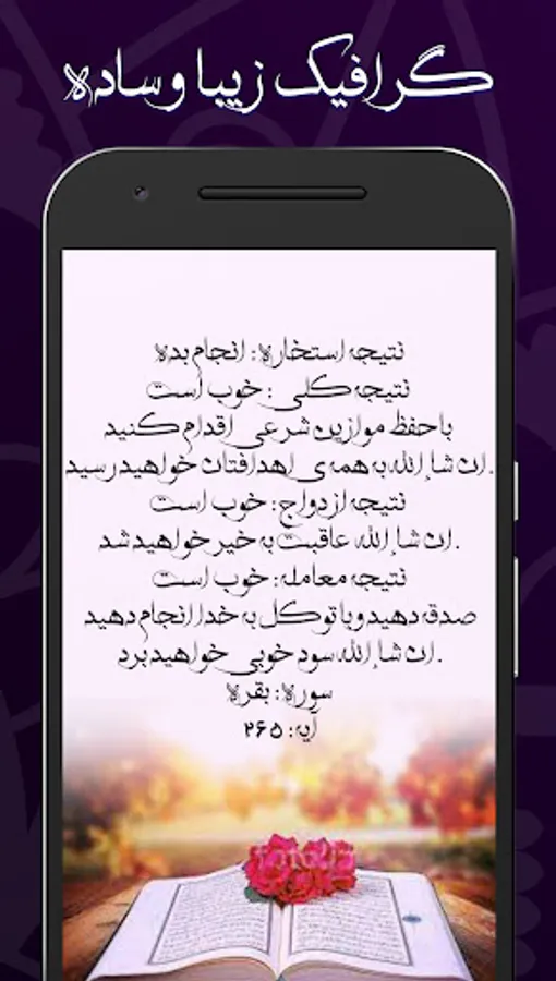 Istikharah application with Quran with complete interpretation is a simple and practical program for taking Istikharah. All you have to do is make an intention and make sure in a few seconds to do things like get married and get a deal. You can also share your Istikharah with others with the complete interpretation of the Quran Istikharah application. In the program of Istikharah with Quran with full interpretation, you can see the text of the verse, the number of the verse and the selected surah. You can also share the result of Istikhara. Istikharah with the Qur'an with a full interpretation is a good practice to ensure that there is work in which there is doubt. A permissible act that Muslims have resorted to many times in their lives. Now you can do Istikharah with the Quran with a complete, simple and practical interpretation. On the main page of the Istikharah application with the Quran, complete the intention and touch the mentioned option and wait for the answer. Install the Istiqhara program with the real Holy Quran. The Istikharah program with the real Holy Quran is completely free. Use Istikharah with the real Holy Quran free of charge. Istikhara is easy to install with the real Holy Quran. Istikhara with the real Holy Quran has no age limit. Istikharah with the real Holy Quran is a small program. Everyone can use Istikharah with the real Holy Quran.