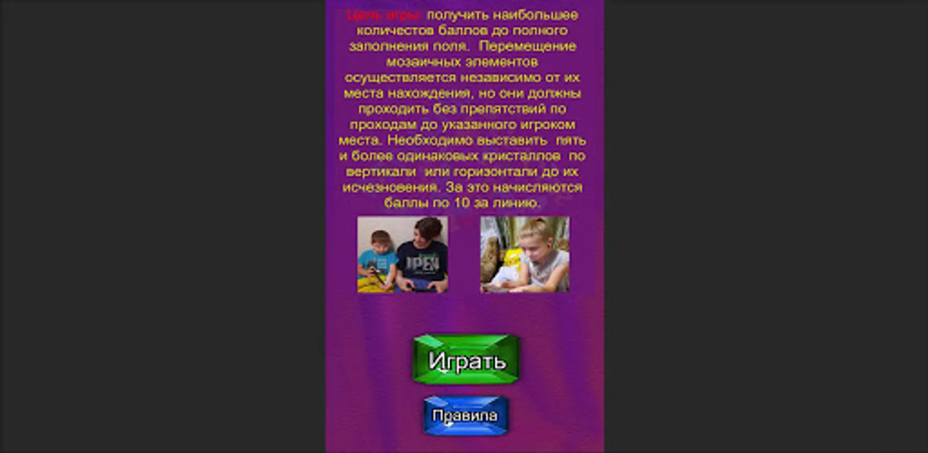 Purpose of the game: get the highest number of points until the field is completely filled. The movement of mosaic elements is carried out regardless of their location, but they must pass without obstacles along the aisles to the location indicated by the player. It is necessary to place five or more identical crystals vertically or horizontally until they disappear. Points are awarded for this at 10 per line.