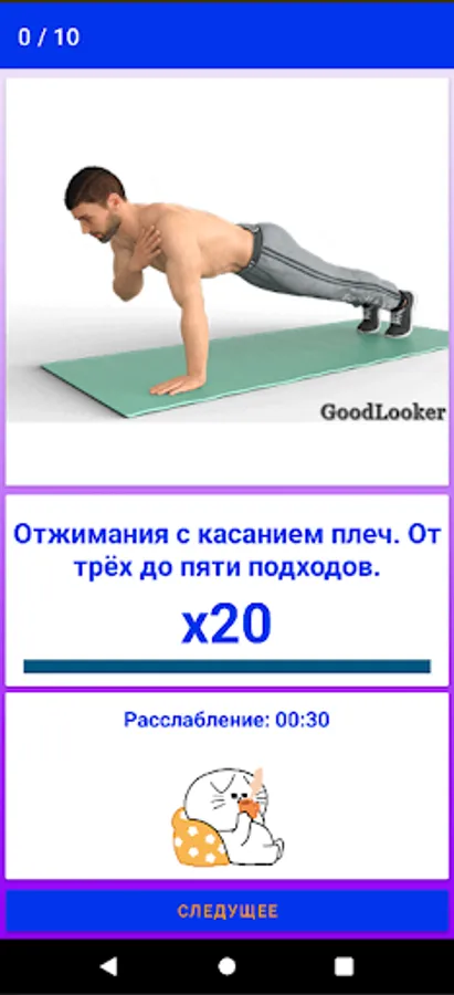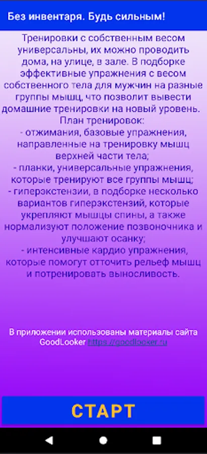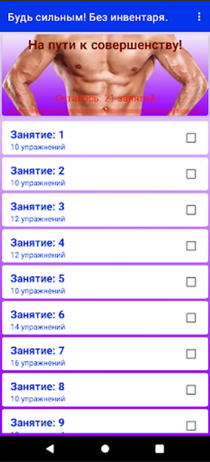 The application offers a set of physical exercises without equipment. Bodyweight workouts are universal, they can be done at home, on the street, in the gym. In the selection of effective exercises with your own body weight for men on different muscle groups, which will take home workouts to a new level. The application contains exercises that will not only help strengthen all muscle groups, but also normalize the condition of the spine and help make a beautiful posture.