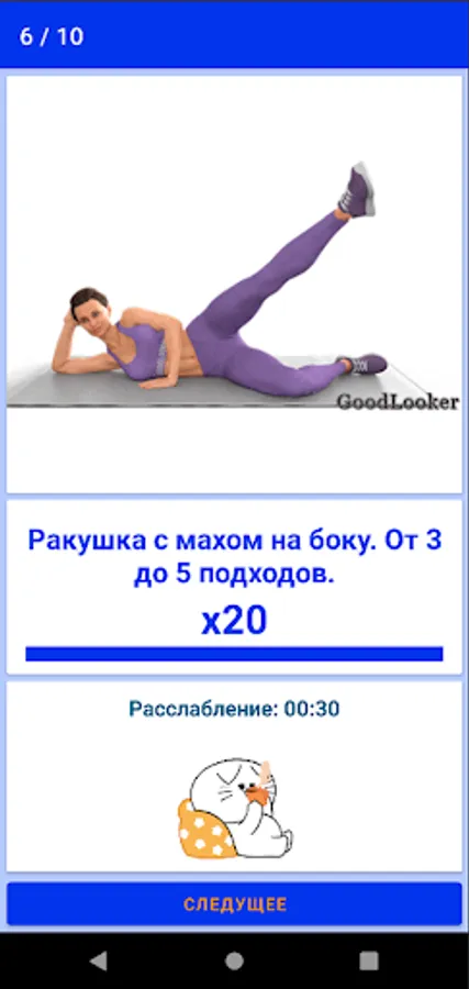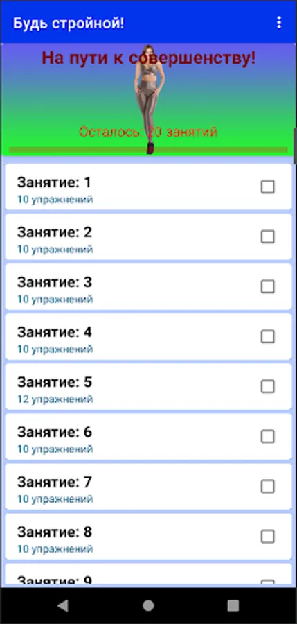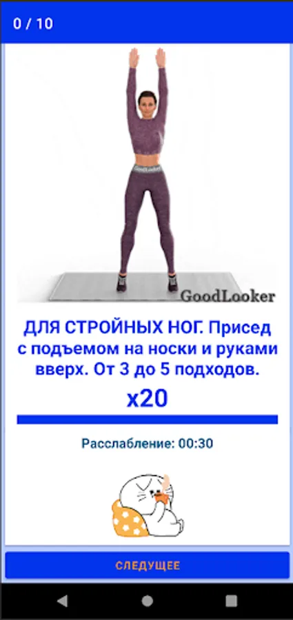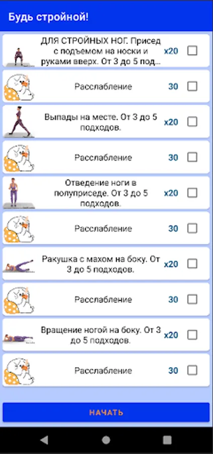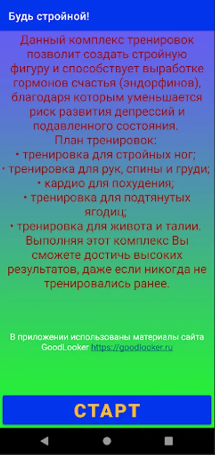 The application offers a set of workouts to create a slender figure without equipment and includes exercises with an emphasis on strengthening the muscles of the legs, arms, back, chest, weight loss, consisting of 20 sessions. Many muscle groups are stressed, which contributes to the burning of excess calories and the production of happiness hormones (endorphins), which reduces the risk of developing depression and a depressed state. Performing this complex, you can achieve high results, even if you have never trained before.