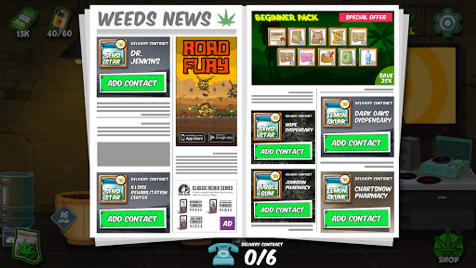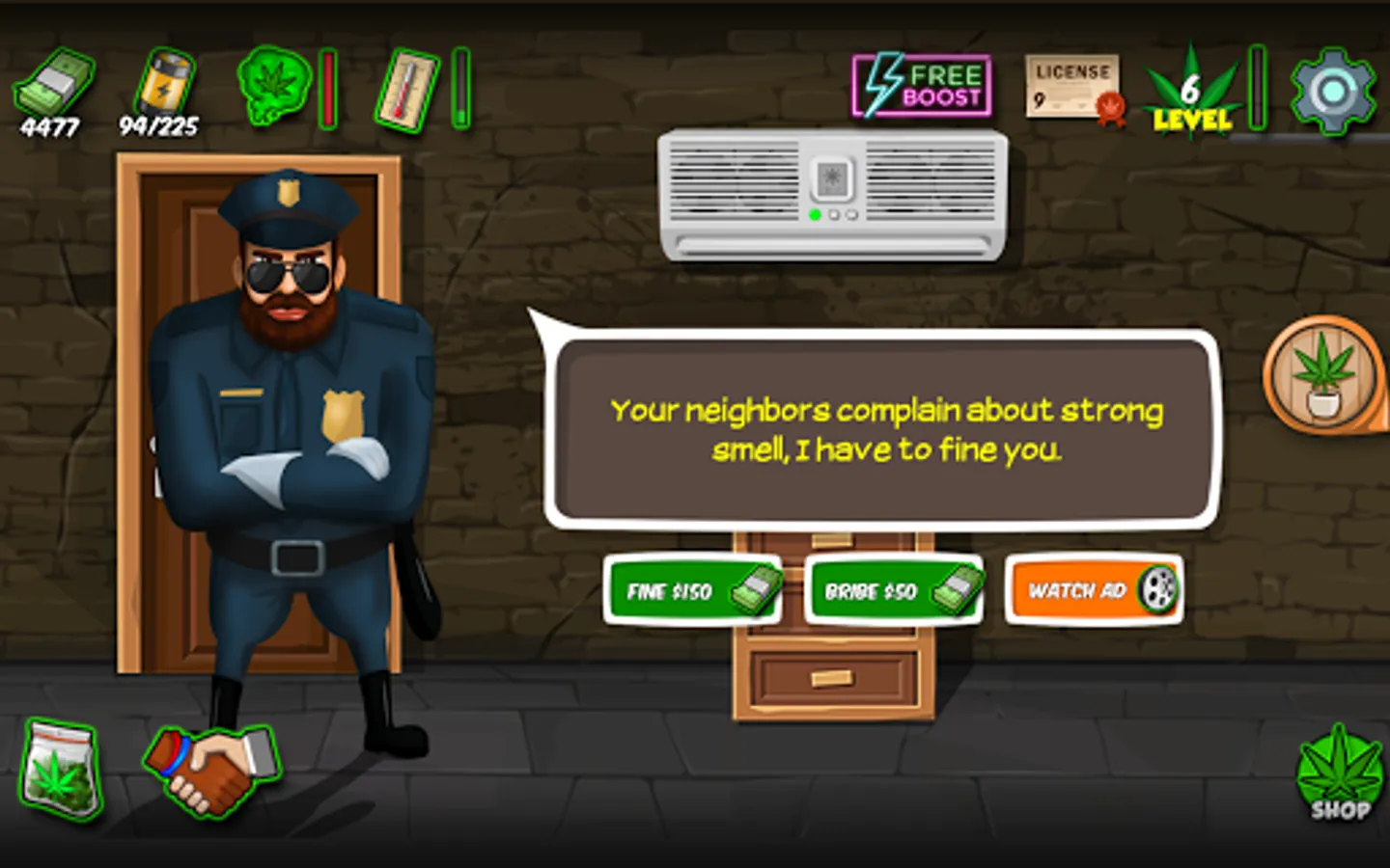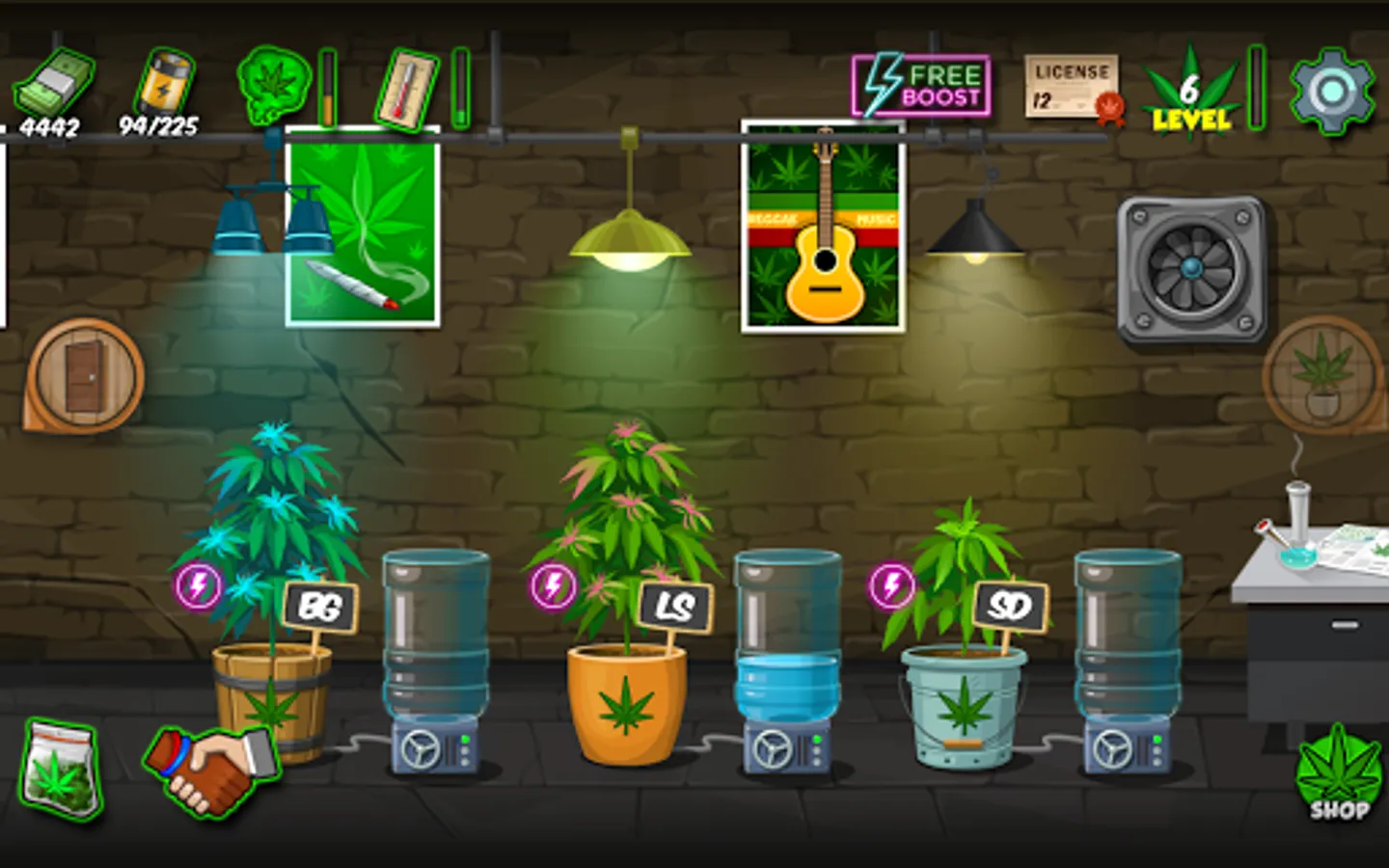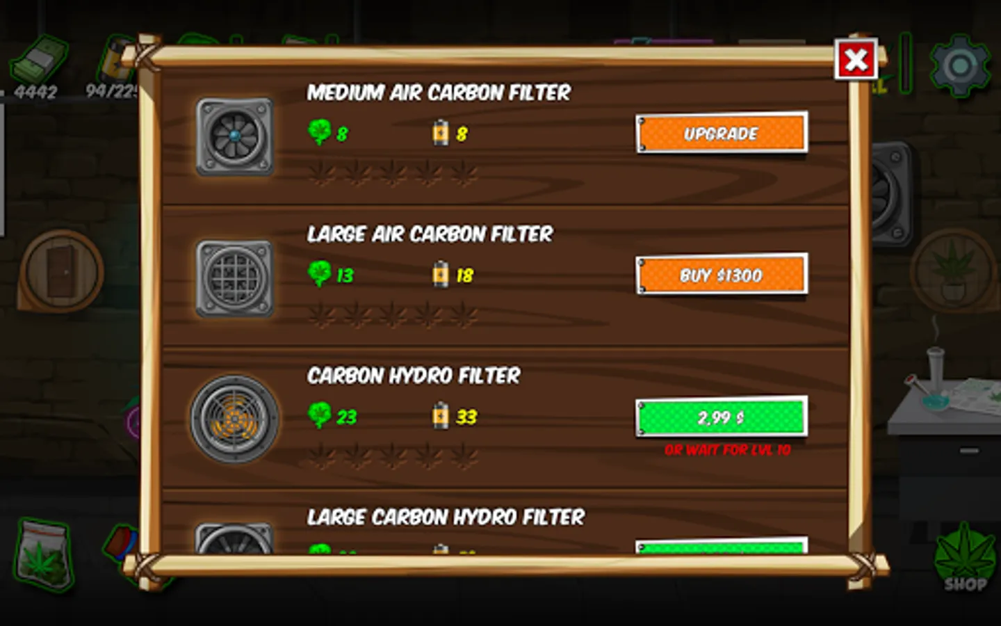 Thanks to new equipment you can build up your pot empire at one stroke. Increase the yield, speed up your plants growth, improve the equipment. Lamp, conditioner, water pumps, upgraded pots, vent systems, and many other things available for everyone who embraces the path of becoming a Kush Tycoon. The main thing is not to forget to watch the electricity.