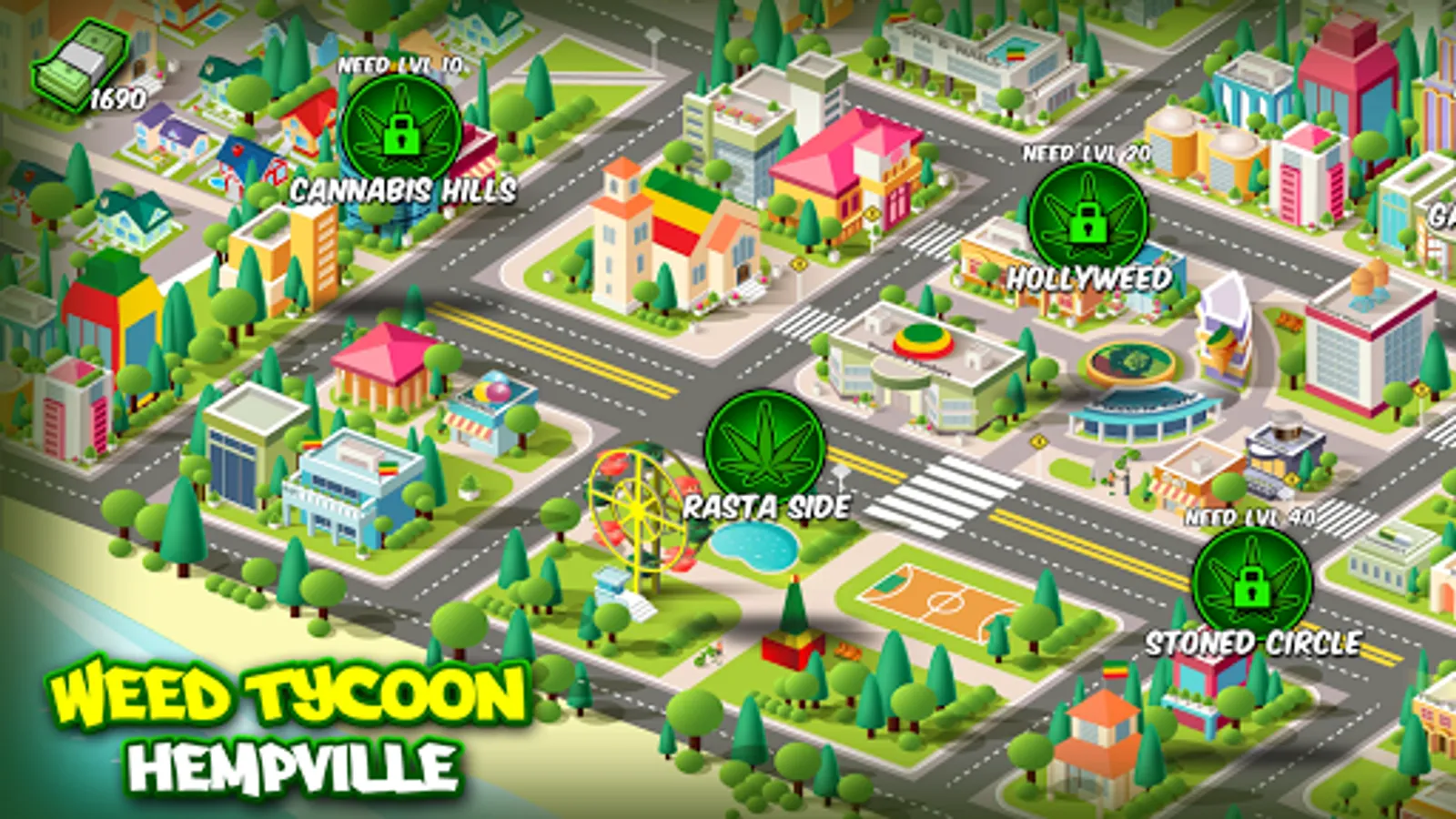 • Apply your bud farm grass roots hacks, - unlock new places: Cannabis Hills, Hollyweed, and Stoned Circle. Establish yourself as a best weed growing pro in all of them.