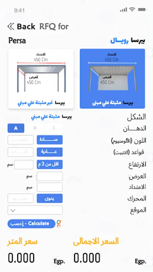 This app Specially designed to helps our clients and Providers to select from our solution, with their specific criteria, selections and dimensions, with simulated real design and ability to provide many suggestions, and accelerating Ordering and sales Process.