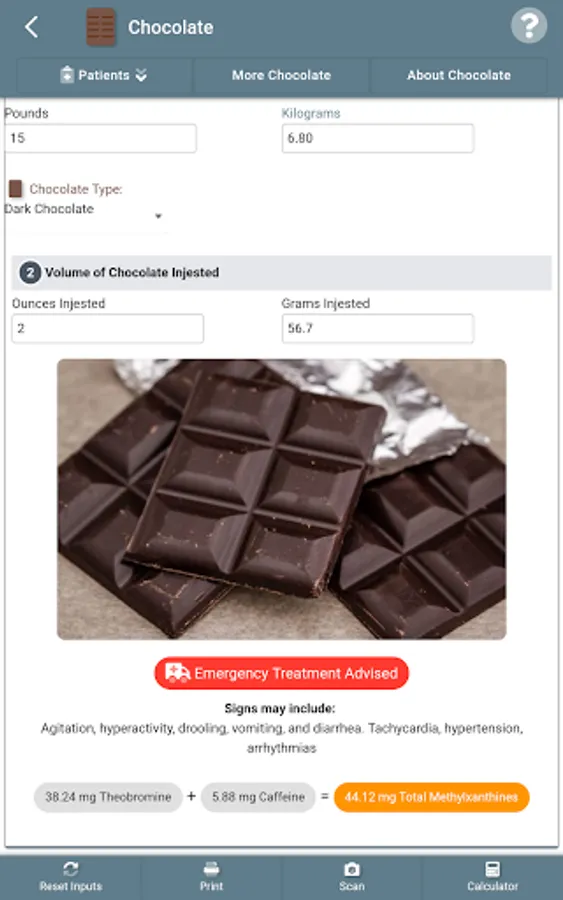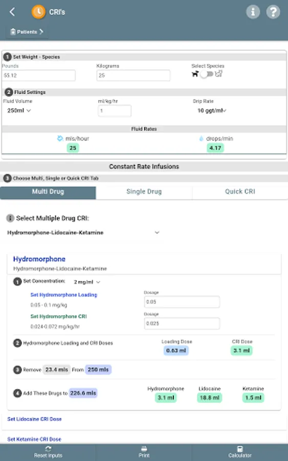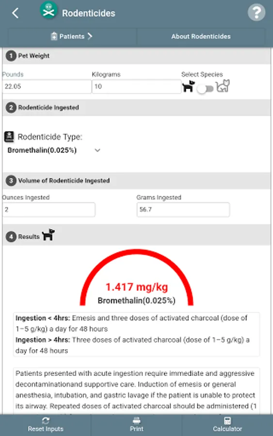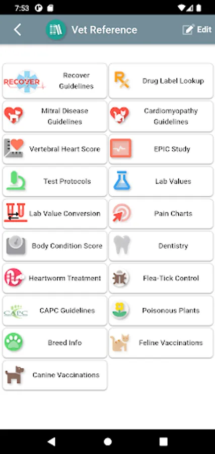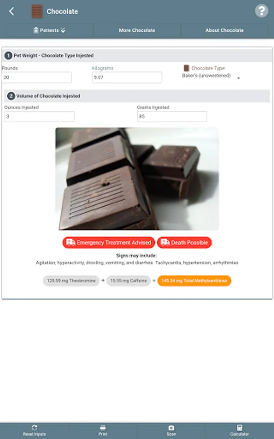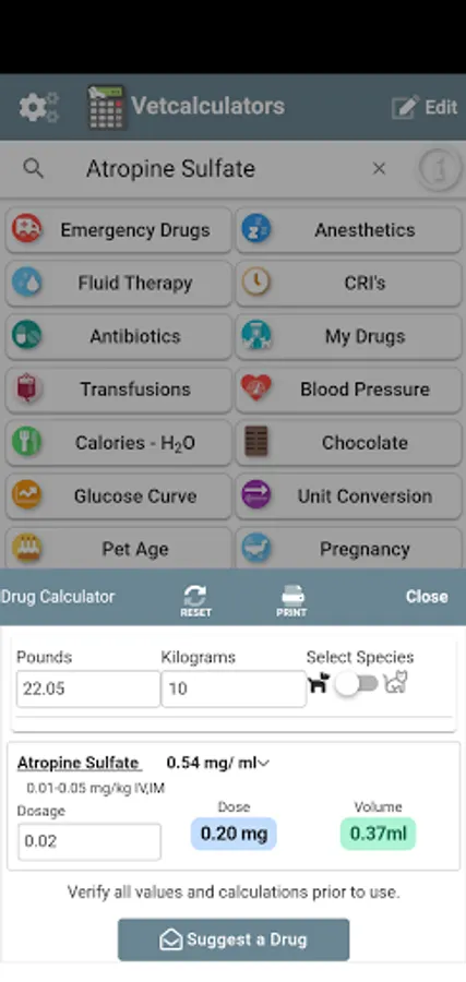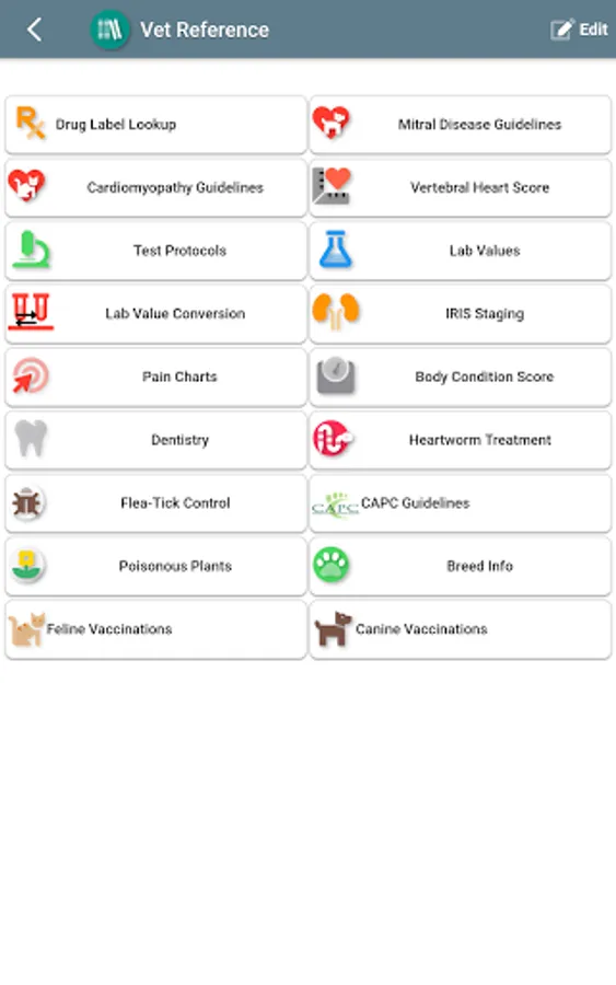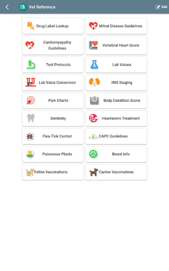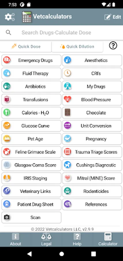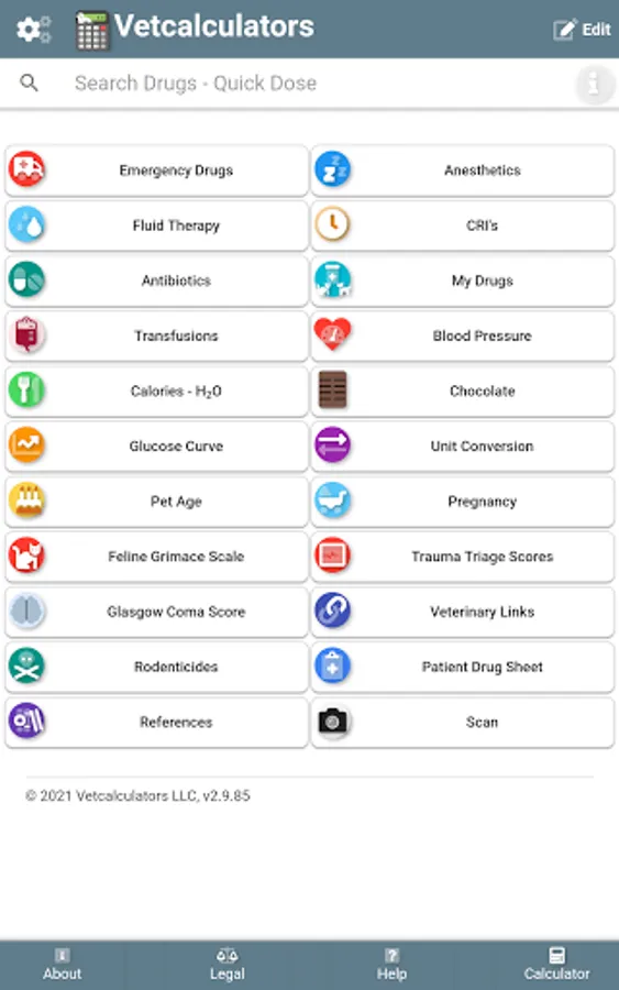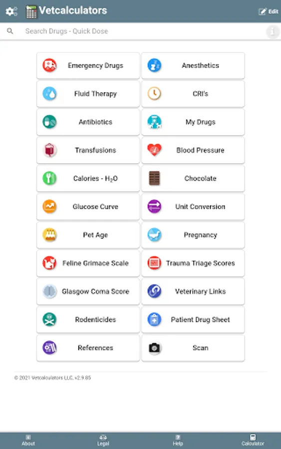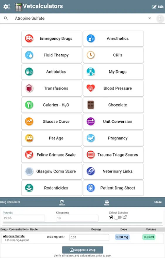 Veterinary Calculators - Emergency Drugs, Anesthetics, CRI's, Fluids, Antibiotics, Common Veterinary Drugs (My Drugs), Calorie Requirements, Blood Glucose Curve generator, Chocolate Toxicity, Rodenticide Toxicity, Blood Transfusions, Blood Pressure, Trauma Triage calculators (3), Feline Grimace Scale, Modified Glasgow Coma Scale, Cushing’s Diagnostic Prediction Tool, Patient Treatment Sheet and Unit Conversion Calculators