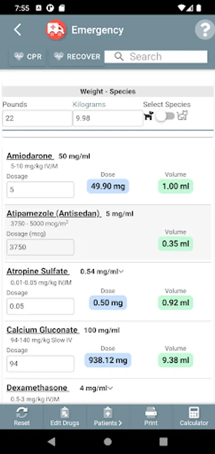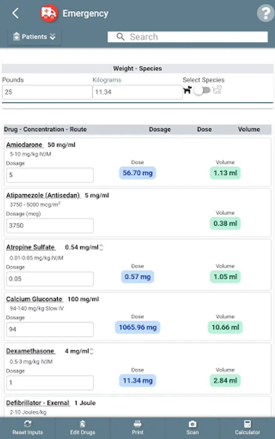 Searchbar on Home Page and Patient Treatment page for all included Vetcalculators Drugs. Type the drug's name and it will popup in a window for quick and easy drug calculations without leaving the Home page.