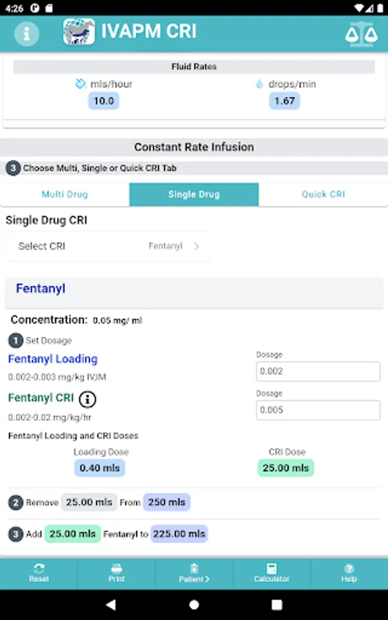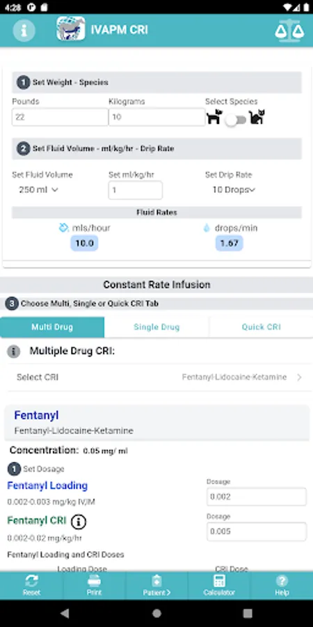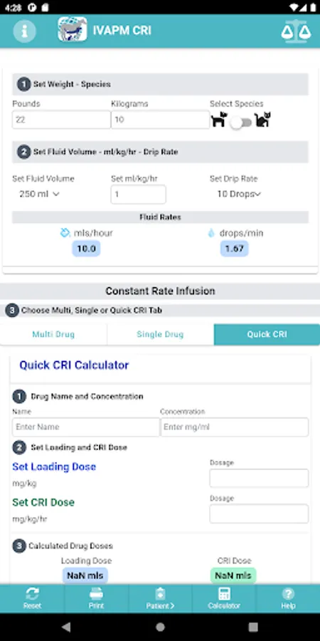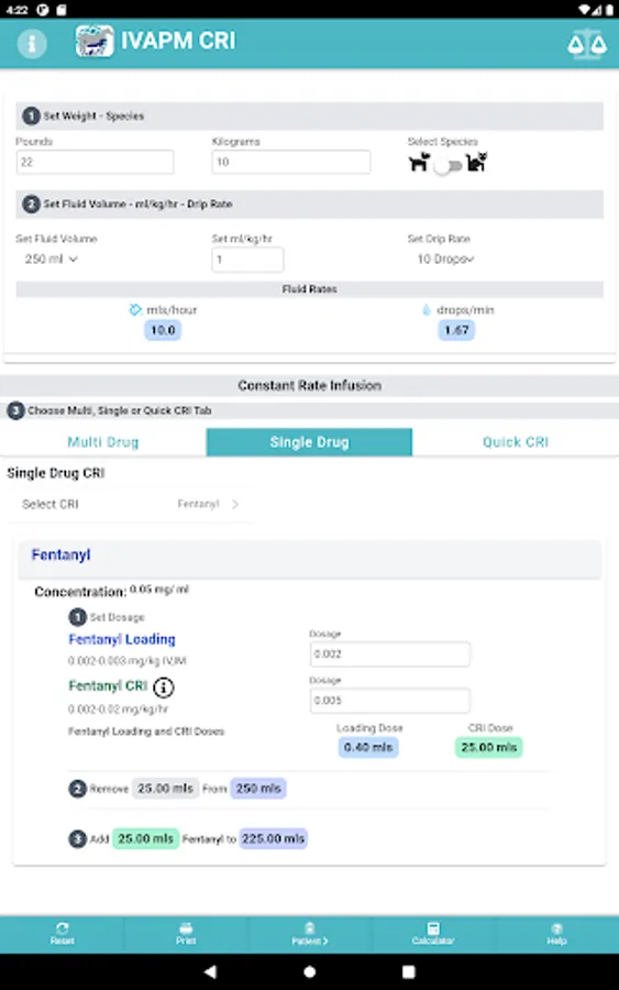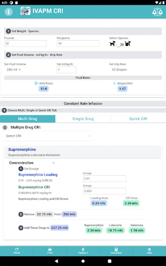 The CRI Calculator calculates Constant Rate Infusions for canine and feline patients. The App requires membership in the International Veterinary Academy of Pain Management (IVAPM).