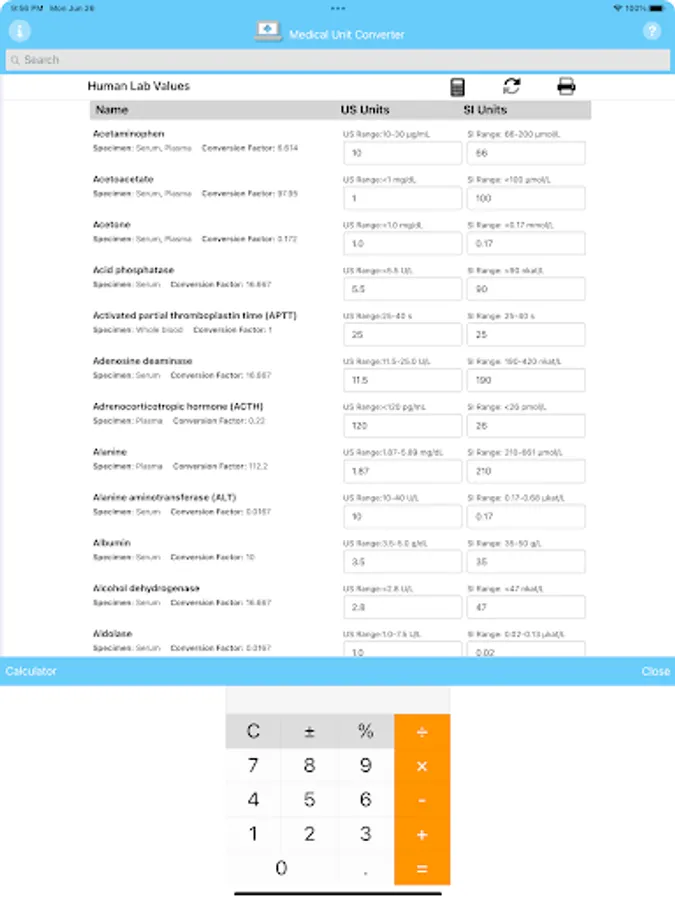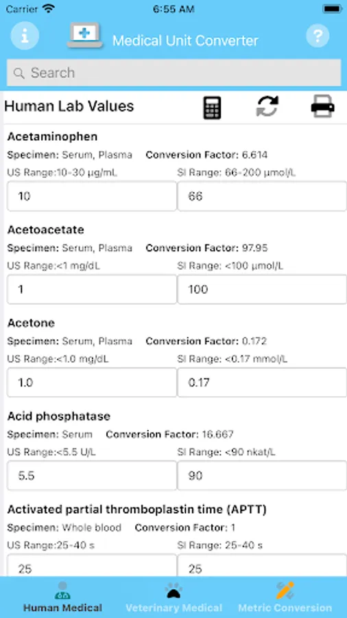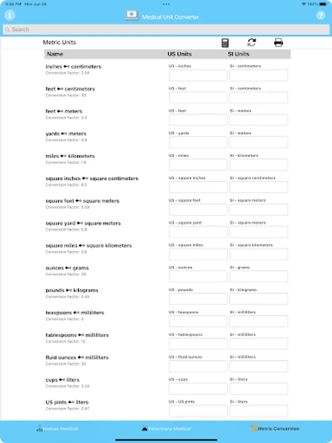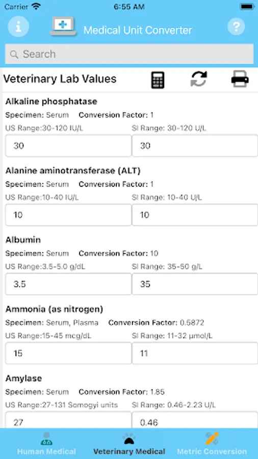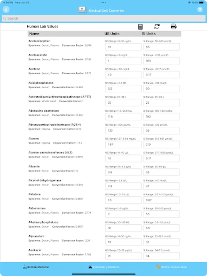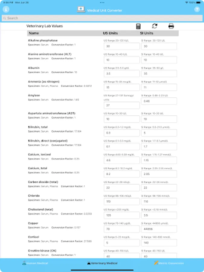 Medical Unit Converter easily converts between US and International Human and Veterinary Medical units and Metric values. Enter a value in either the US or International input area and it will immediately be converted. Search for individual Units by typing in the name of the test.