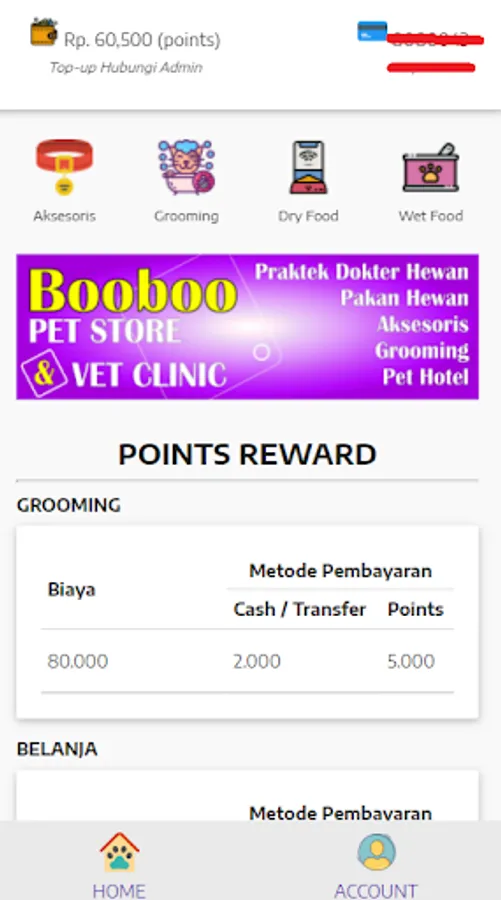 Aplikasi menampilkan produk booboo pet store dan untuk member bisa melihat jumlah points yang dikumpulkan.