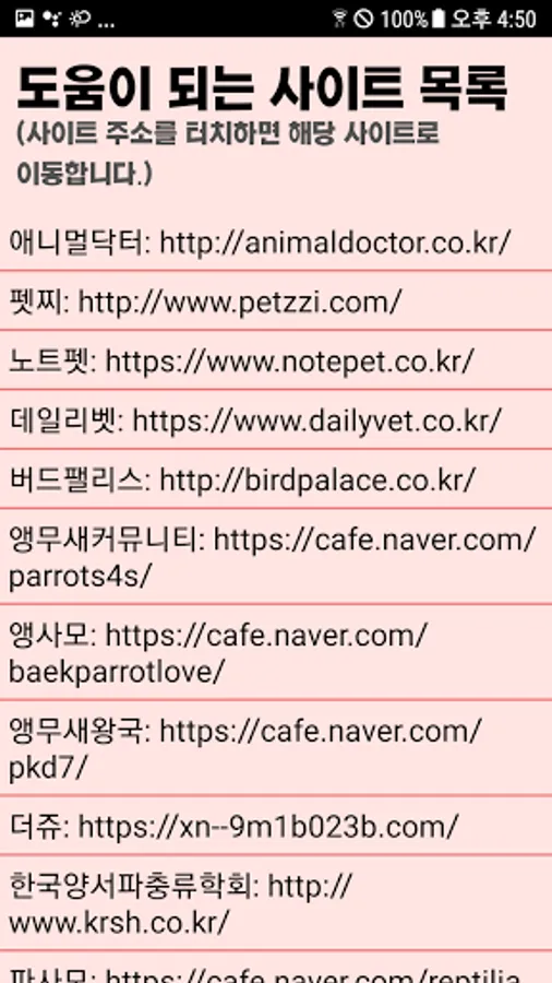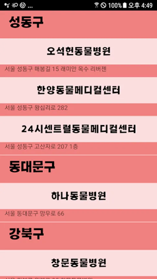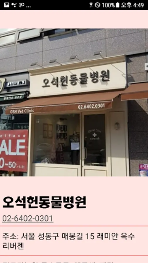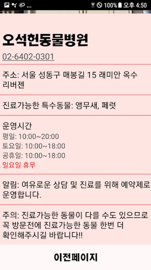We made it easy for people who raise special animals to know and visit hospitals that treat special animals in their vicinity. Hospitals that can treat special animals by region are organized and information on hospitals is included. The hospital information page contains the hospital phone number, address, business hours, and types of special animals that can be treated. By pressing the phone number, you can call the hospital directly, and the hospital homepage will be updated later. It also contains explanations of diseases that special animals suffer, as well as simple treatments and countermeasures. Sites that may be helpful to those who raise special animals are also included, so that special animal owners can access more information on special animals. We plan to implement review function, favorites and blacklist functions in future updates.