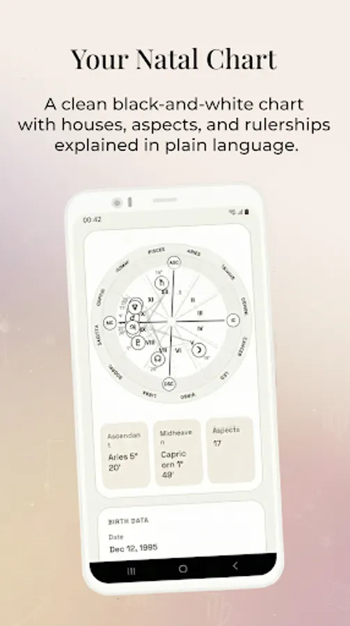 Behind every horoscope is a natal chart, and in Luvsa it stays classic but calm: a clean black-and-white wheel with your Rising sign, Sun, Moon and planets.
