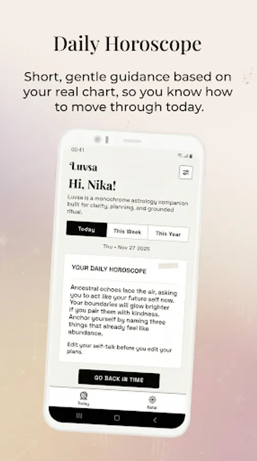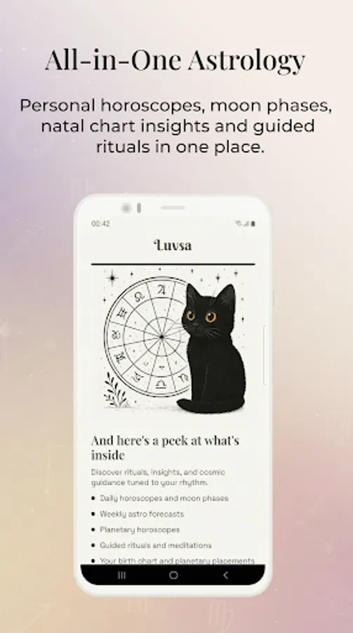 Where many astrology apps are loud and generic, Luvsa is quiet and personal. Soft black-and-white illustrations, a cosmic cat, and carefully written astrology texts create a space where you can breathe out, slow down, and reconnect with yourself.