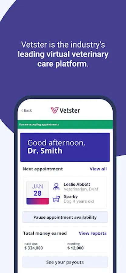 Vetster offers veterinarians the opportunity to provide virtual care to pet owners. Our user friendly platform schedules your time, takes payment, provides appointment notifications and directly deposits your earnings. A complete telehealth solution - all in one place. It’s that simple. You only pay a small platform usage fee per appointment.