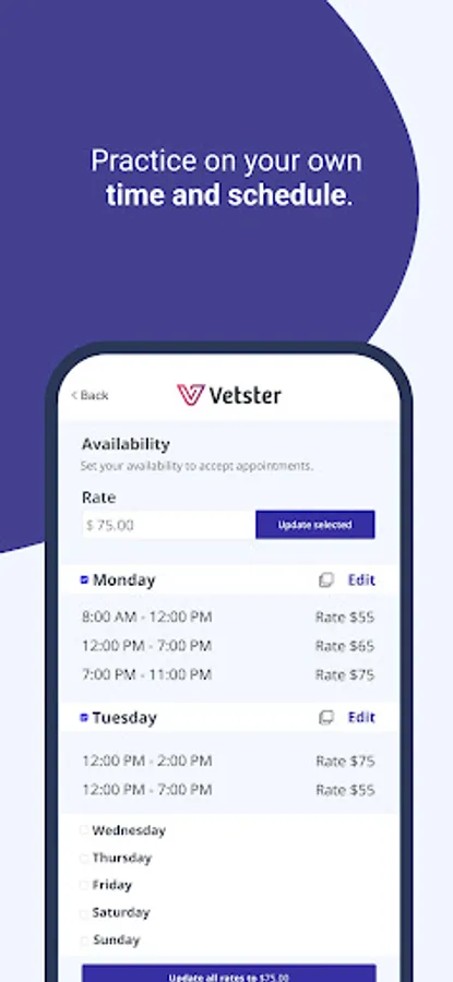 Vetster’s easy-to-use calendar management feature lets you set your availability by time and day of the week.