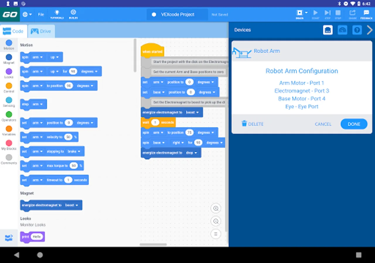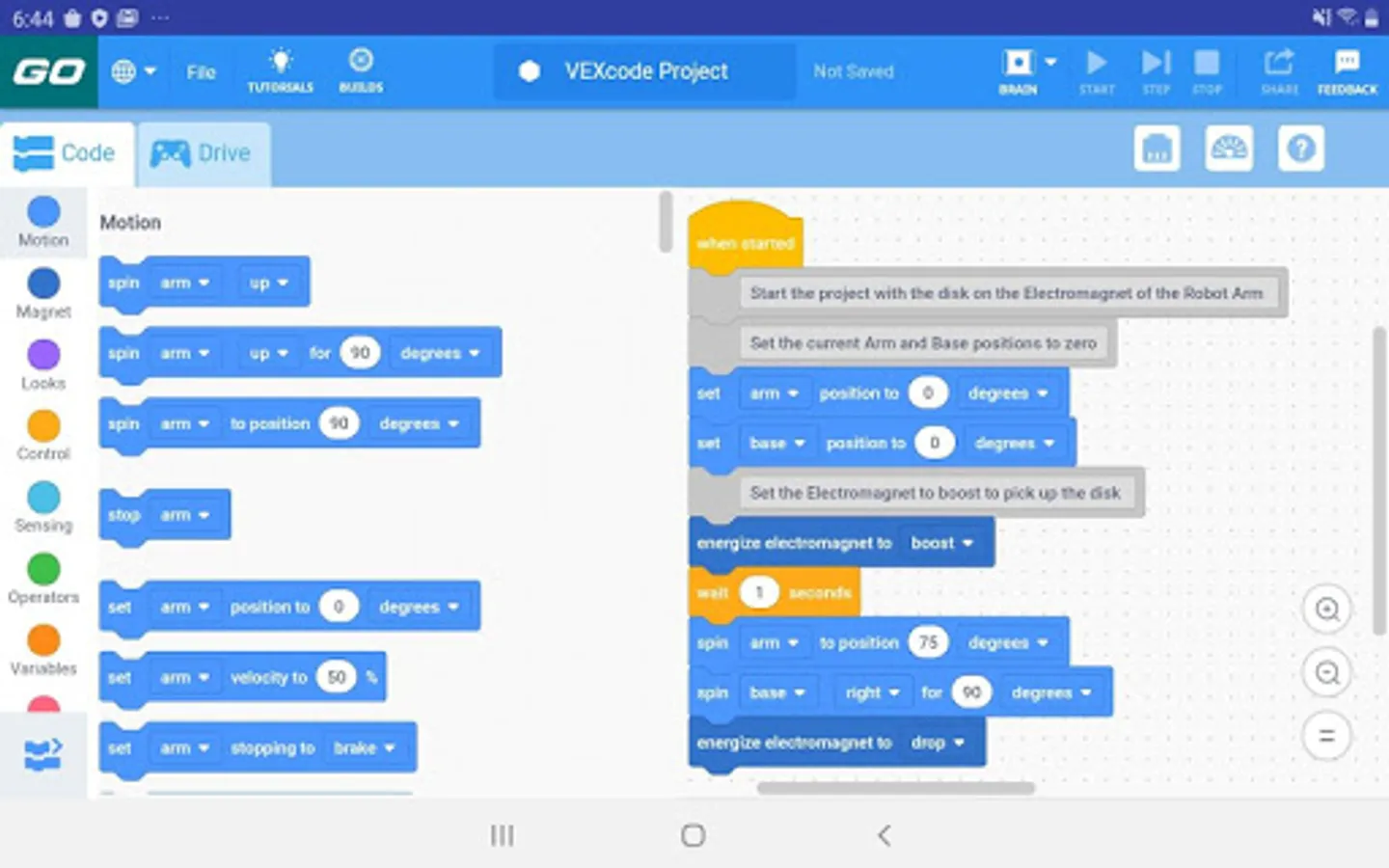 VEXcode Blocks is the perfect platform for those new to coding. Students use the simple drag and drop interface to create functioning programs. Each block's purpose can easily be identified using the visual cues like its shape, color, and label. We've designed VEXcode Blocks to allow those who are new to robotics to get their robot up and running faster. Now, students can focus on being creative and learning computer science concepts, not stuck trying to figure out the interface.