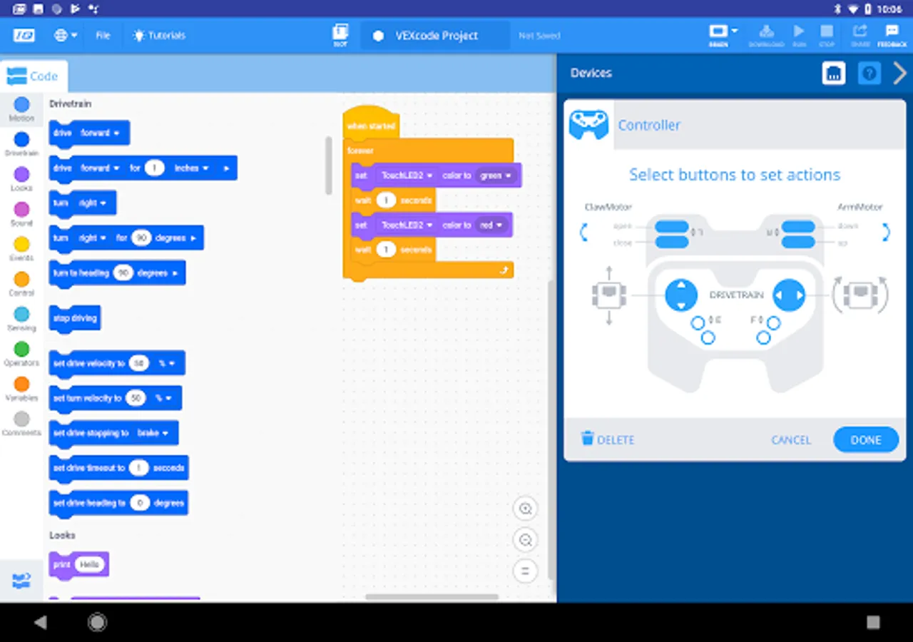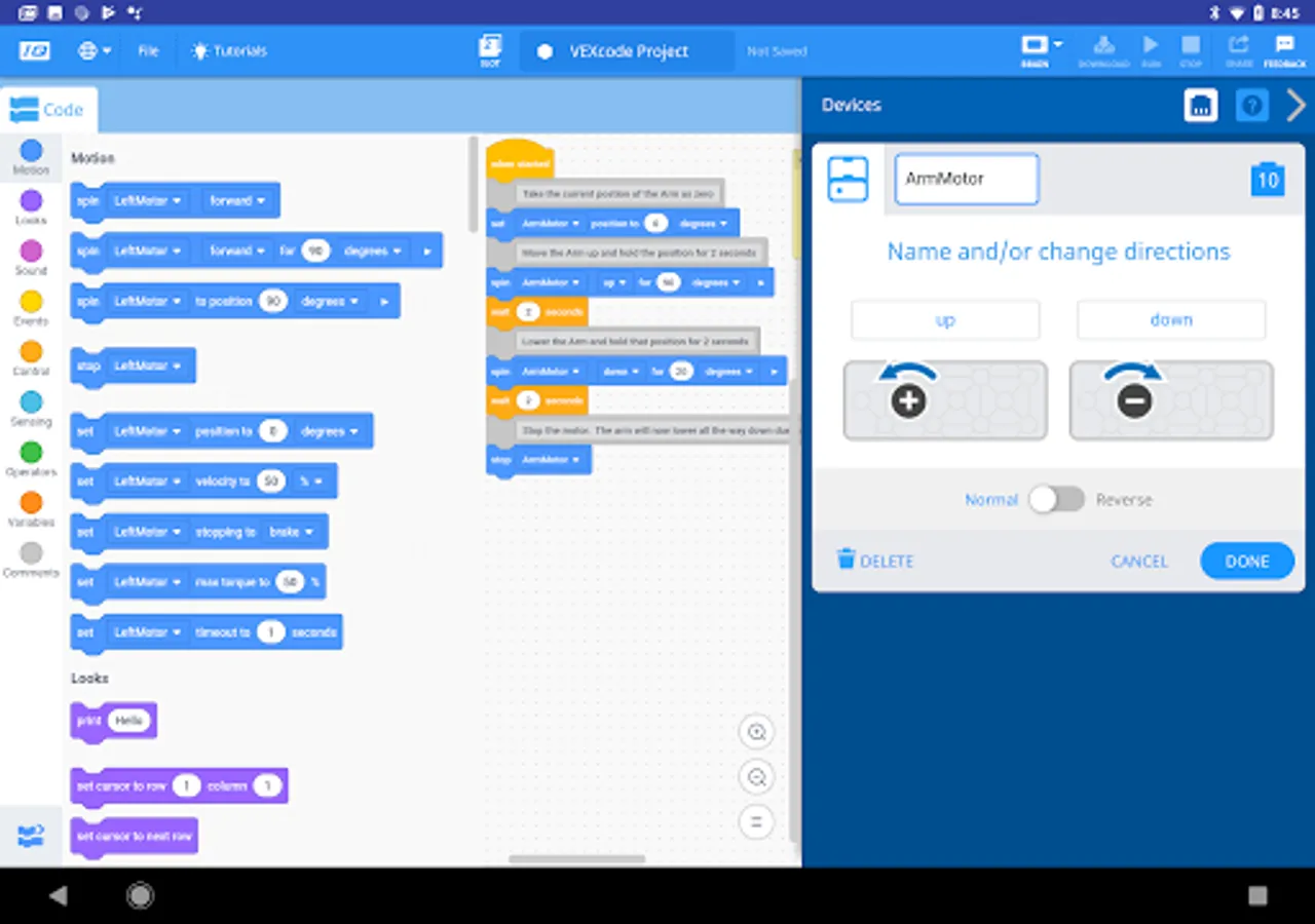 VEXcode's device manager is simple, flexible, and powerful. In no time at all you can setup your robot's drivetrain, controller features, motors, and sensors.