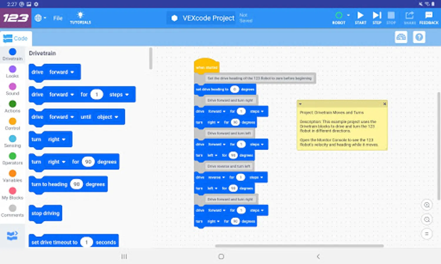 From driving forward, making precise turns, setting speed, and stopping precisely, VEXcode makes it easier than ever to control a robot.