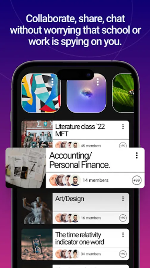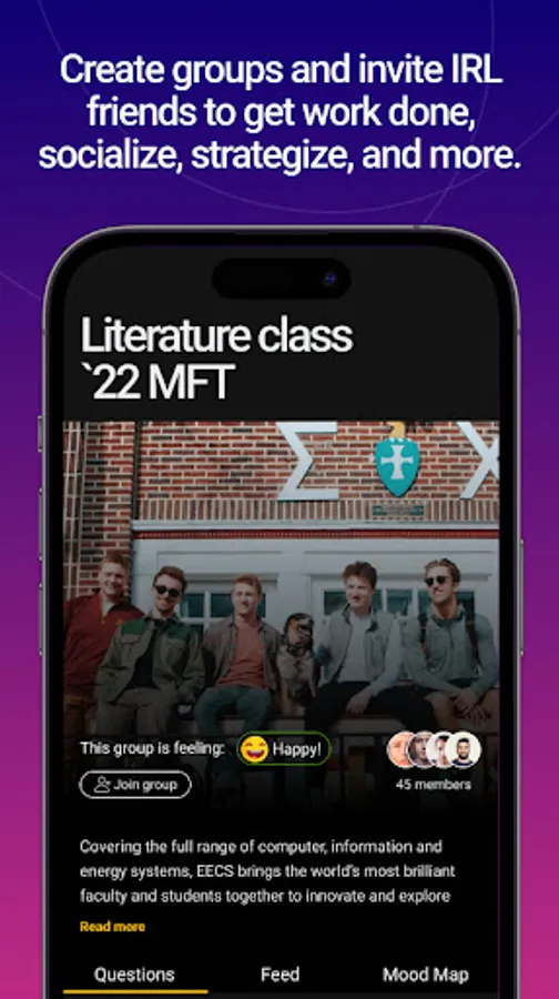 With VEXT you form groups or join groups with your peers. Those groups can be around your chemistry course, literature class, AP calculus prep, lacrosse team, volunteer project, whatever. Share your mood (anonymously) within the group each day as you collaborate. Trade notes. Ask questions. Work together. And as you do so, share your moods and see your friends' moods together.