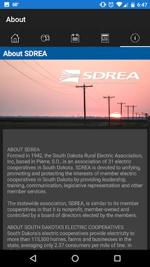 The SDREA app features a searchable database of co-op employees and directors as well as a full schedule of conferences and events. The SDREA app keeps you informed and connected with the electric cooperatives of South Dakota.