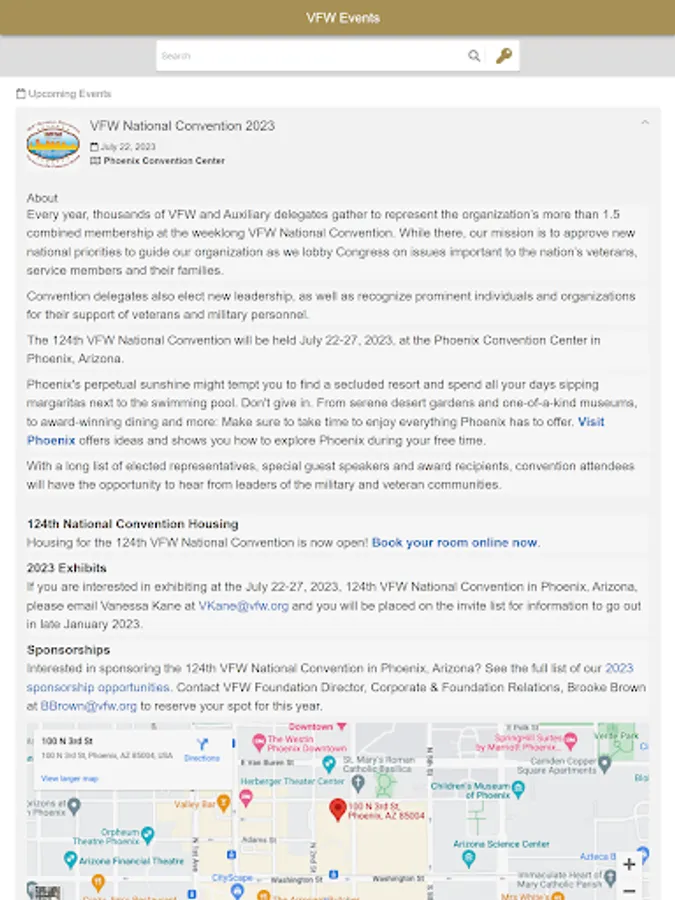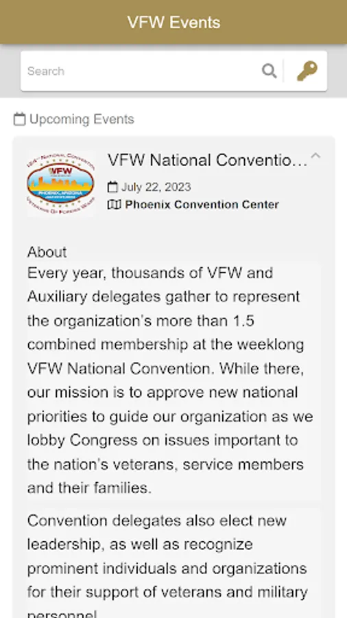 The VFW Events app allows for attendees of the VFW’s Legislative Conference and National Convention to receive important notifications and reminders throughout the events, gain instant access to the daily agenda, the opportunity to connect with other. Since 1949, the VFW's annual Legislative Conference has provided an opportunity for VFW leaders from each state to personally lobby their respective lawmakers and watch as the VFW's current Commander-in-Chief testifies on Capitol Hill before the House and Senate Veterans' Affairs Committees on behalf of veterans. Guest speakers are invited to address conference delegates, and since 1964 the VFW's Congressional Award has been presented annually to one sitting member of the House or Senate for their significant legislative contributions on behalf of those who have worn the uniform. Also at the event, the winners of the Voice of Democracy and Patriot's Pen scholarship contests are announced. Each national winner reads their winning essay before conference delegates and are presented with their winnings. Every year, thousands of VFW and Auxiliary delegates gather to represent the organization’s total membership of nearly 1.6 million at the weeklong convention. While there, our mission is to approve new national priorities to guide our organization as we lobby Congress on issues important to the nation’s veterans, service members and their families. Convention delegates also elect new leadership, as well as recognize prominent individuals and organizations for their support of veterans and military personnel. attendees and more.