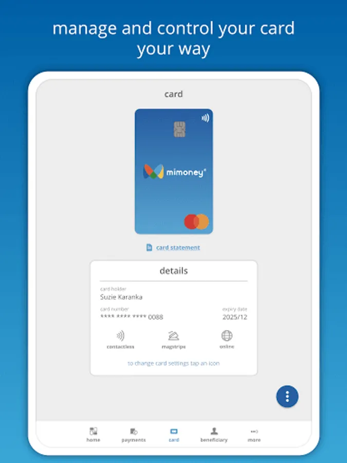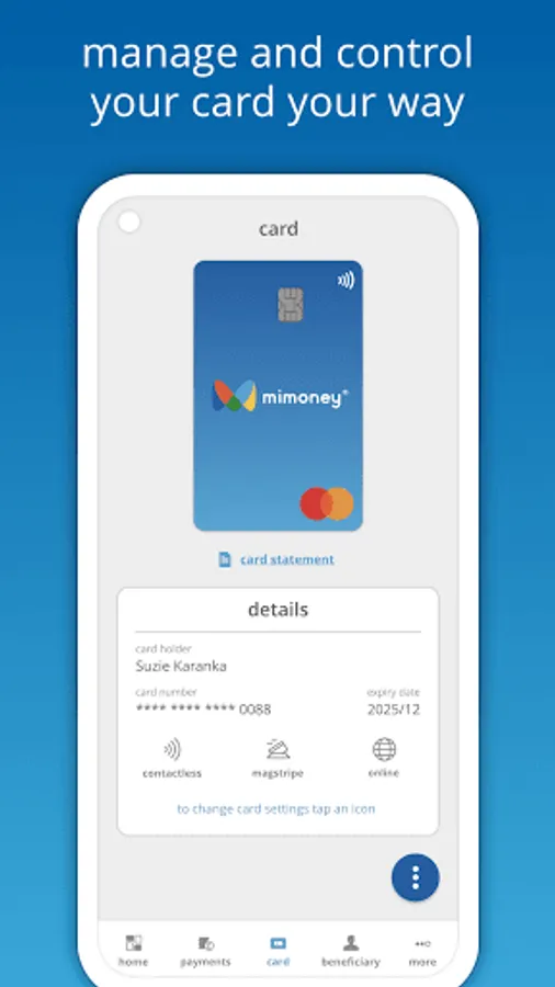 - Make online and in-store payments with your Contactless mimoney Mastercard