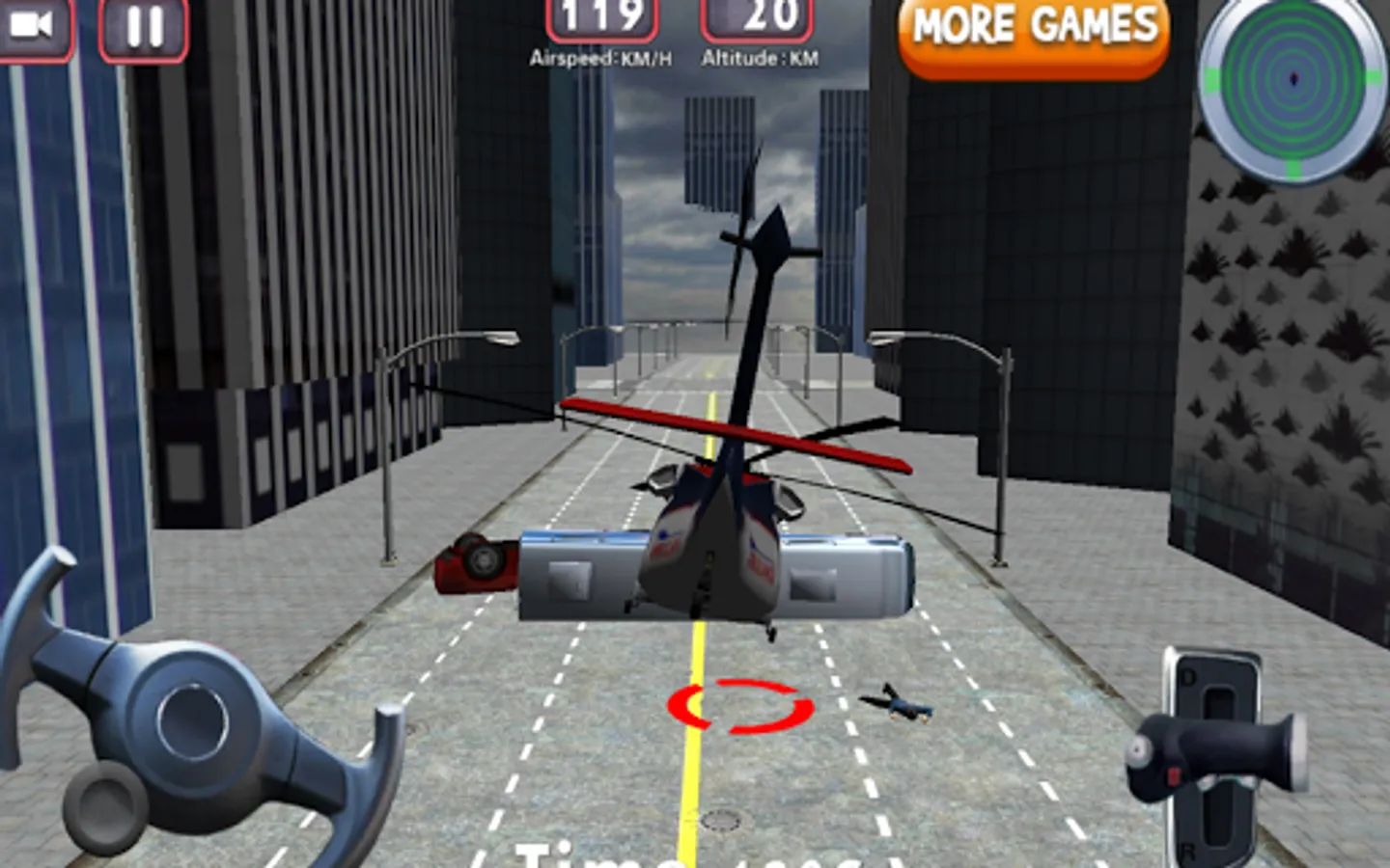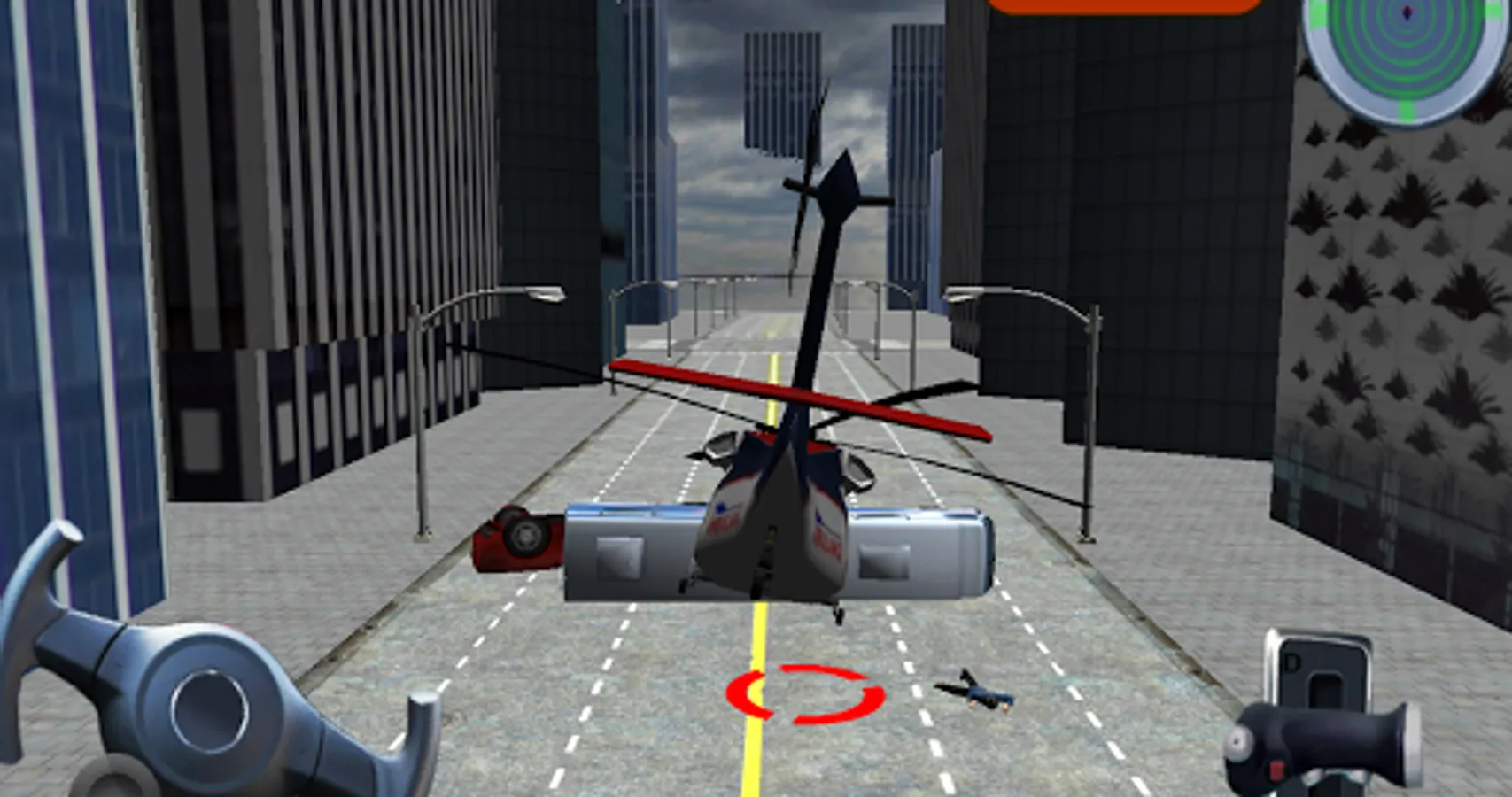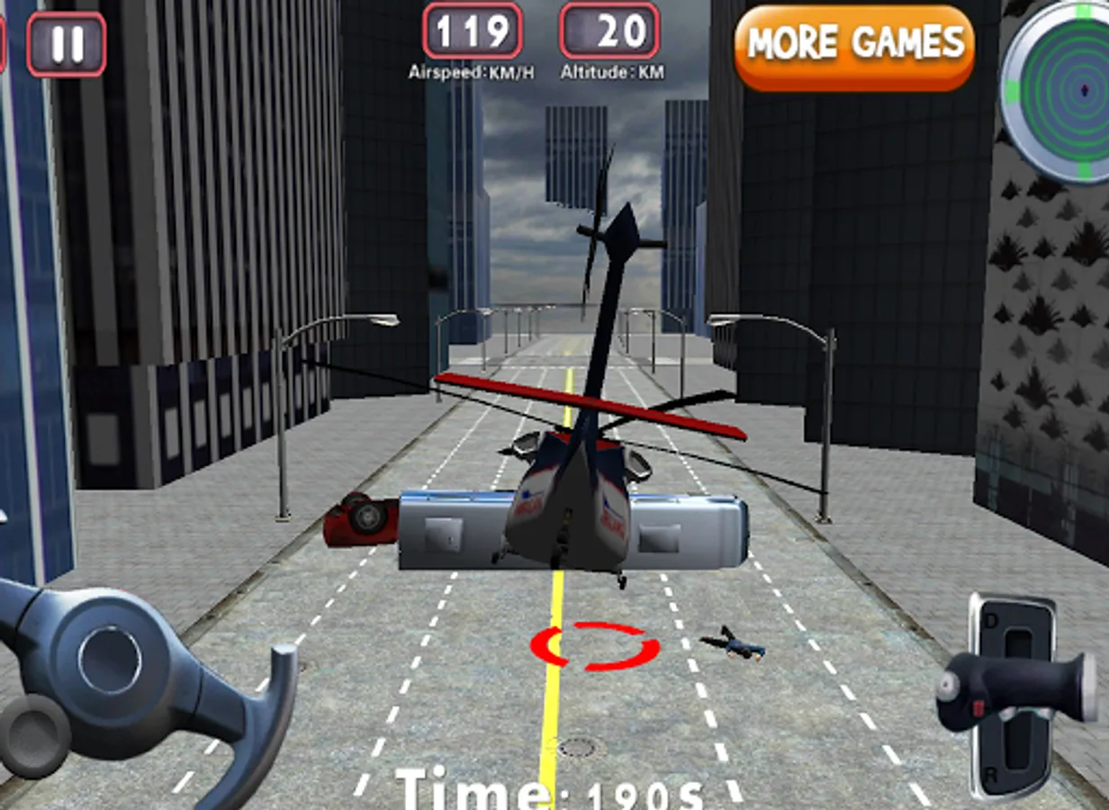 Your job in this insane heli sim 3D game is to fly to the people that need your help asap! You can read the navigation information on your radar in the corner of your screen. After every new emergency call you get the flight information in this radar. Use the flight directions to get as quick as possible to that accident, clear the victims from the street. There are two ways of flying change the view to inside cockpit or follow the helicopter from behind to its destination. In cockpit view the arrow indicator shows you the correct directions.