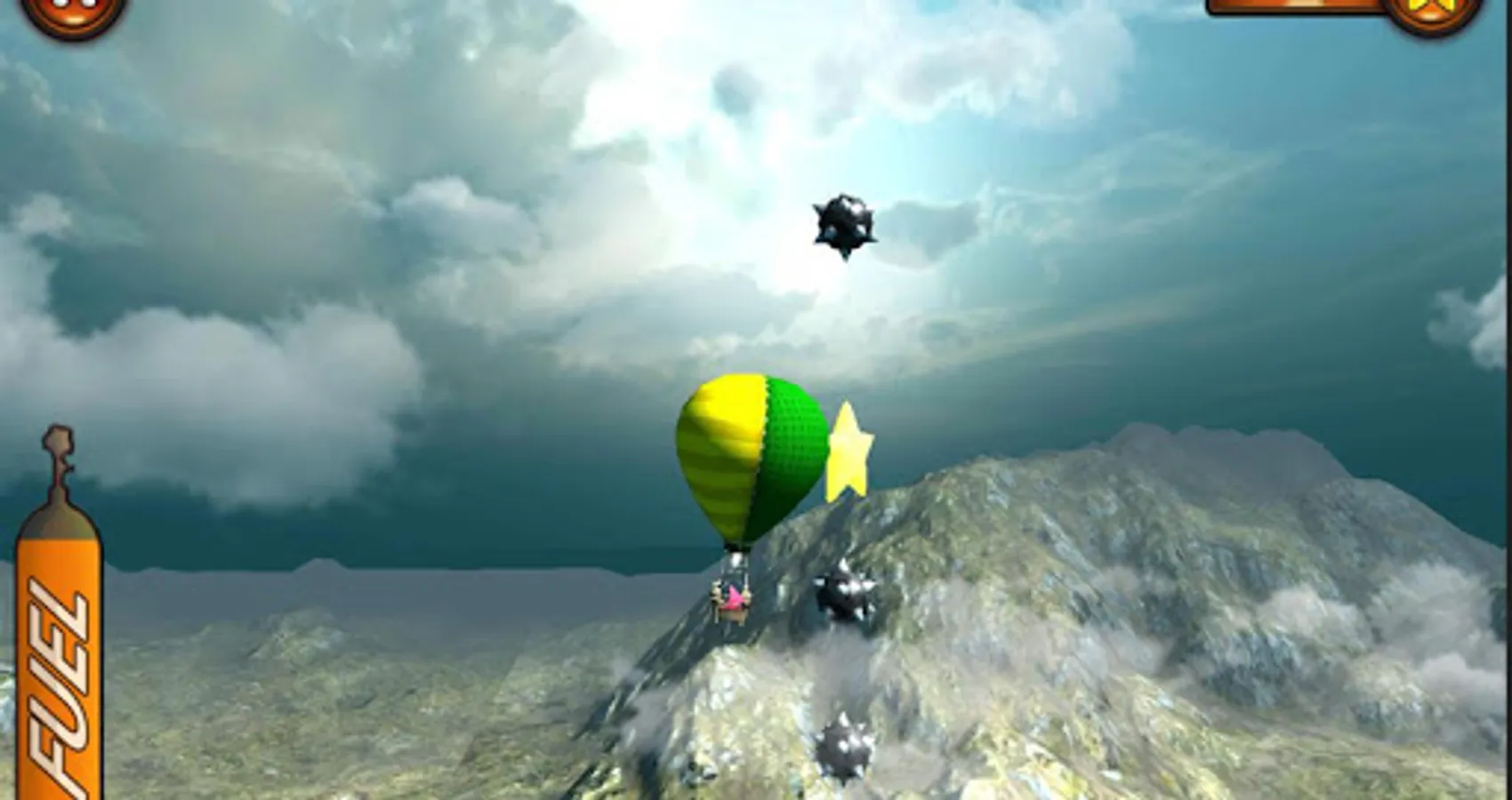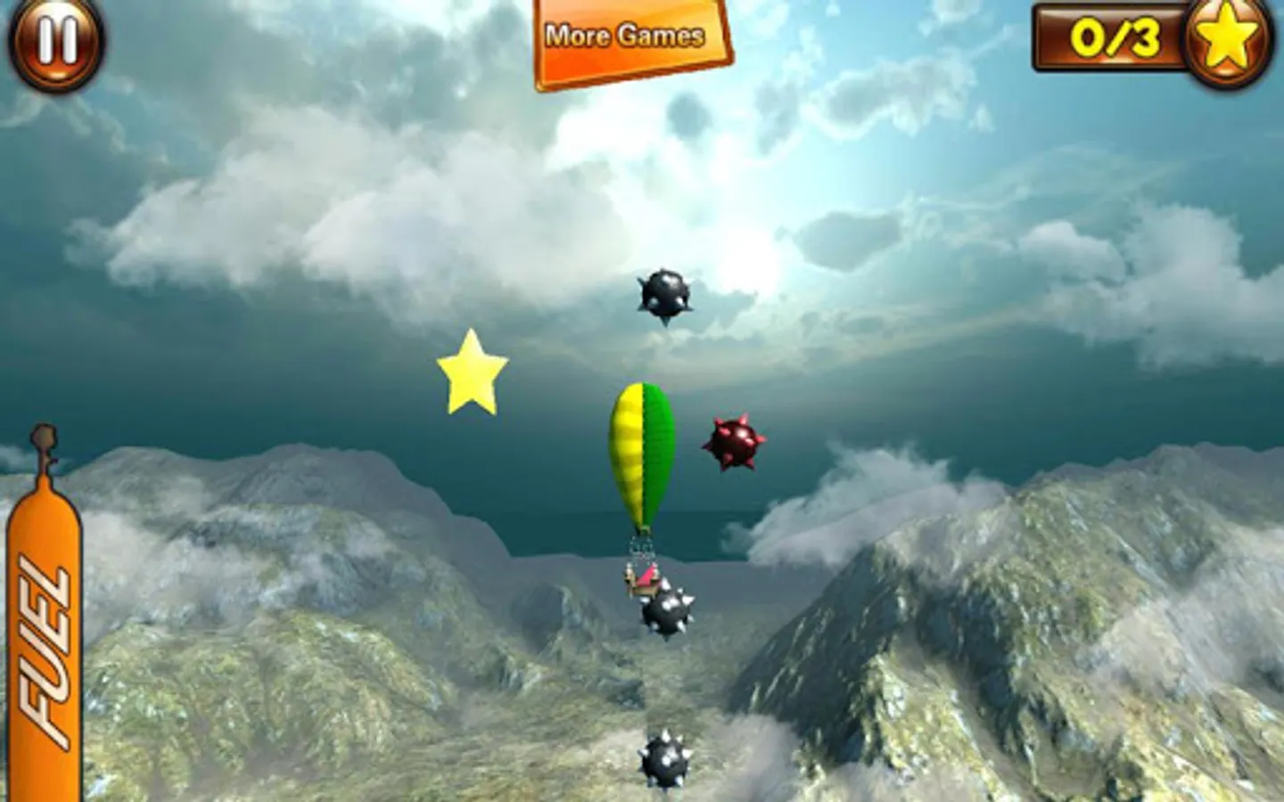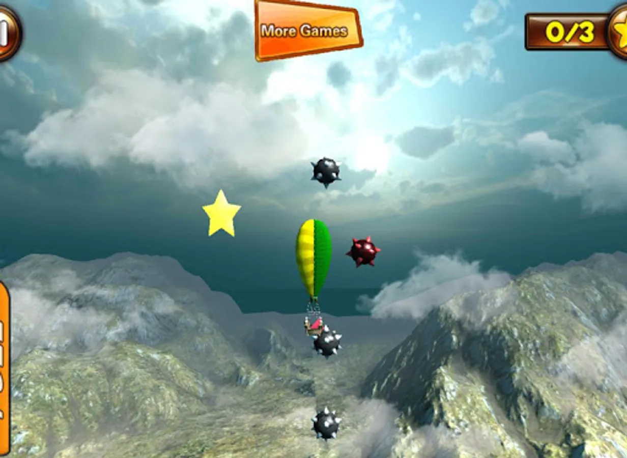 Controlling your blimp comes naturally. It’s not rocket science. Ballooning has never been this easy! By tapping the screen you control the burner. Tap to go up, release to go down. When you take off to the virtual air you will encounter several different air currents. By navigating the dirigible in one of those currents you can float from left to right and the other way around. Just keep your inflatable balloon in the current you want and float towards the stars you have to collect. After collecting 3 stars you can fly to the end of the level and finish the journey by parking the hot air balloon on the landing platform. Air currents can be recognized by looking at the wind and the clouds. Easy to learn, hard to master!