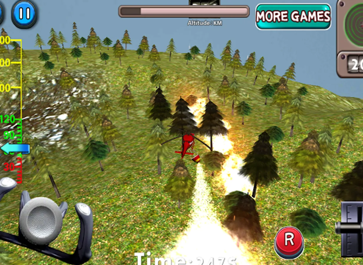 As a firefighter helicopter pilot you have a serious task your job is to extinguish the fires in the forests. Fly your firefighting helicopter drop the firefighter chemicals on the fire. Avoid crashing into the trees or into the ground, also be careful you don’t let your helicopter fly to near the fire otherwise you will catch fire yourself. This is something you need to prevent. Try to successfully complete all the levels and we hope you will have fun with this awesome simulation game!