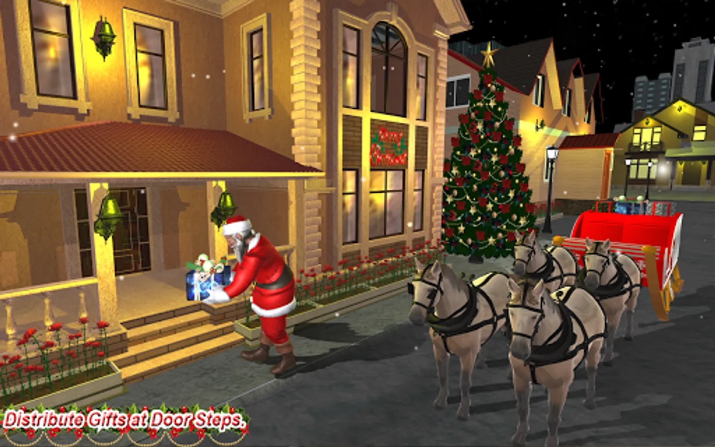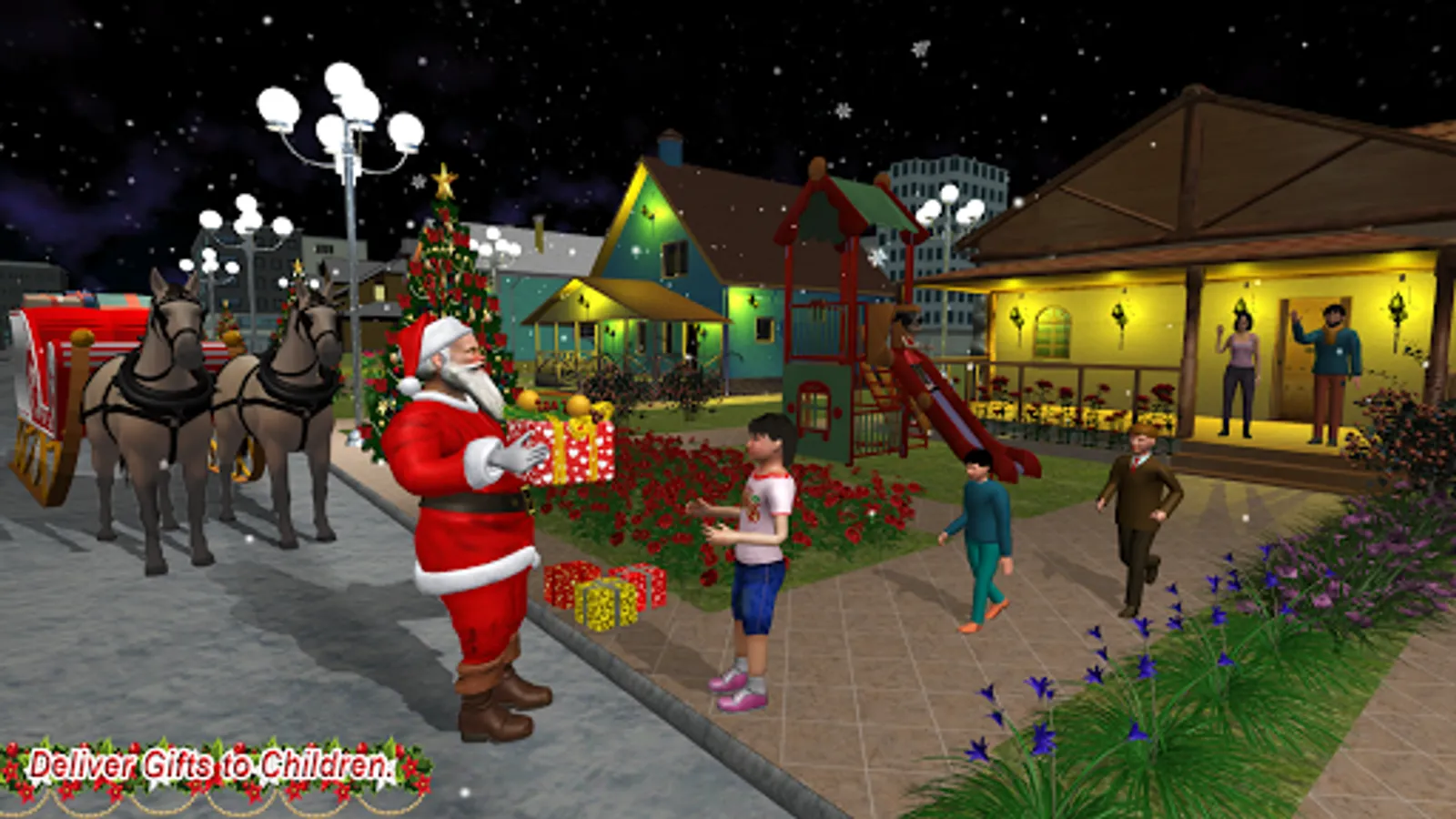 Everyone is happy, everyone is enjoying because it's Christmas. New Year is coming. Everyone is throwing party to their family members. Parties season is on. Gifts are being traded everywhere with full of love with each other. Town's people are very excited and children are anxiously waiting for Santa to come and give them gifts. People have placed Christmas trees full of jingle bells and Christmas stars along the roadsides and the doorstep of each house. All the children are playing with the fluffy snowman around the city. Now its time for the Santa Claus to spread happiness all over the globe. Play the beloved Santa now during this Christmas Eve day, you get the Santa cart full of gifts attached with jingle horses. Your missions are to ride this horse sleigh as well as reindeer sleigh as a Santa Claus and deliver these precious gifts to kids. This beautiful Christmas game provide you the role play that kids love in Christmas holidays. Children are skating on snow and making a snowman in their playgrounds and your duty is to give some precious gift to them. Ride them on your sleigh and visit the whole city.