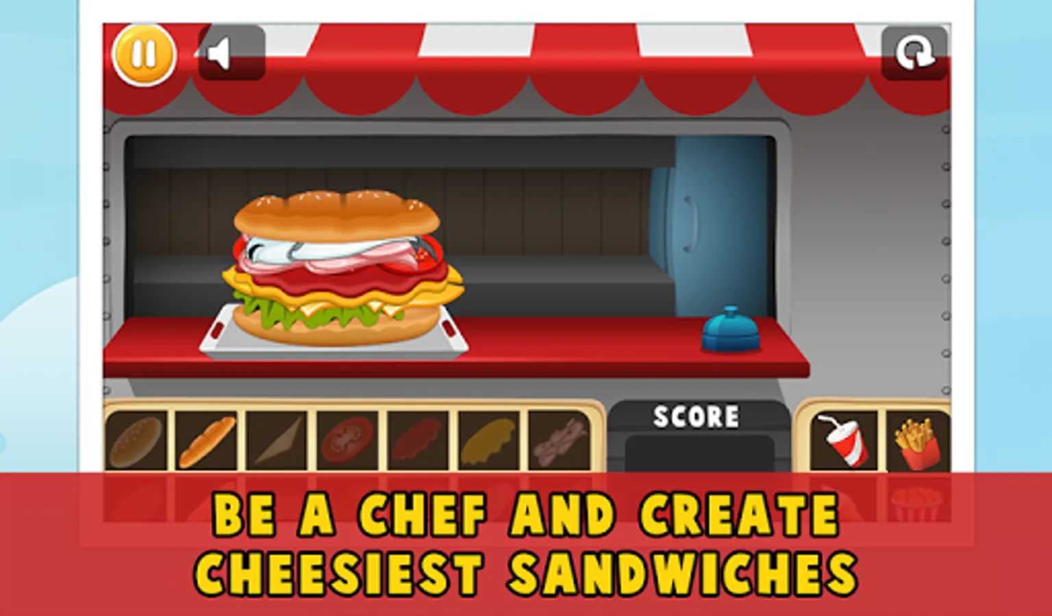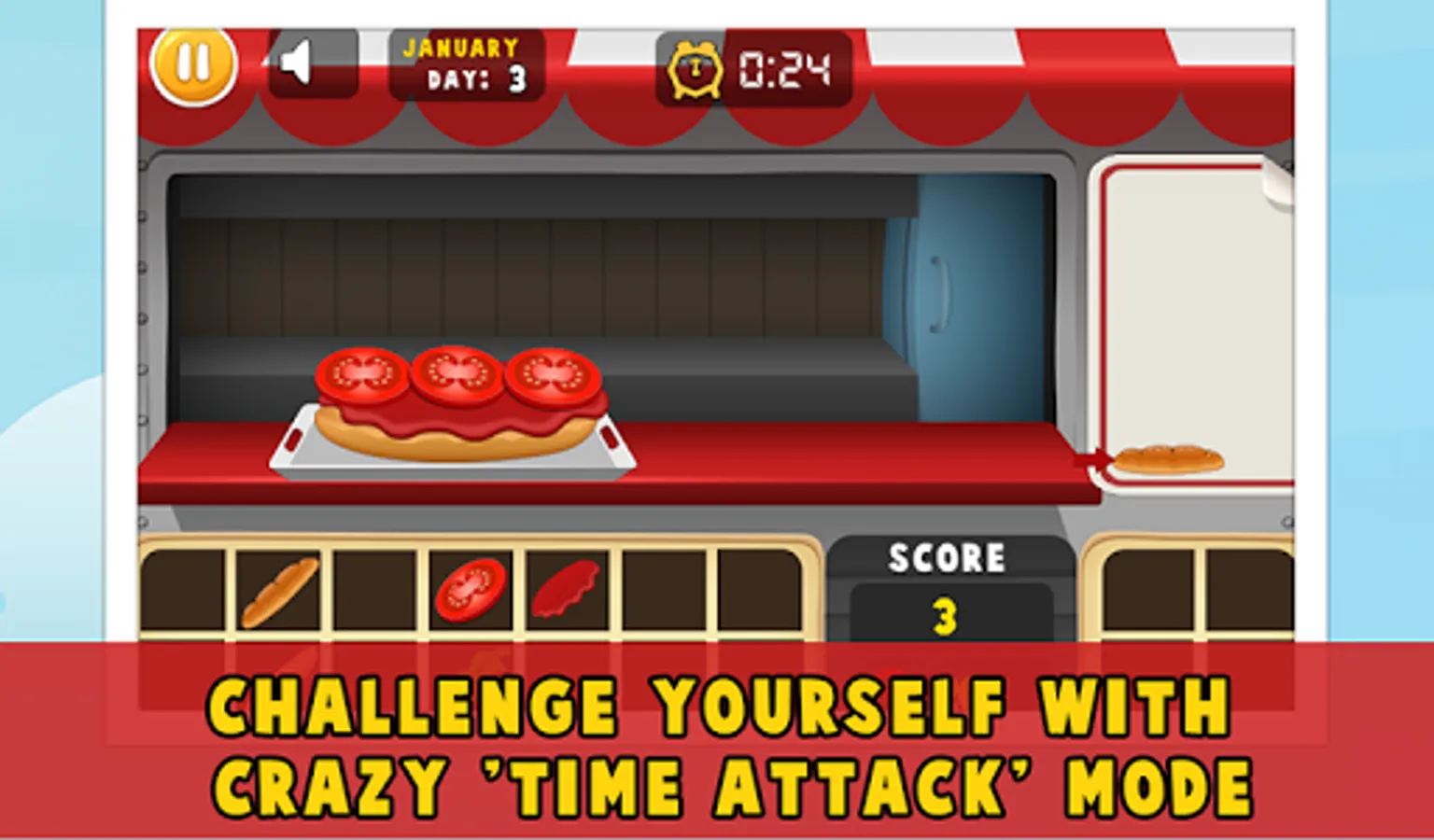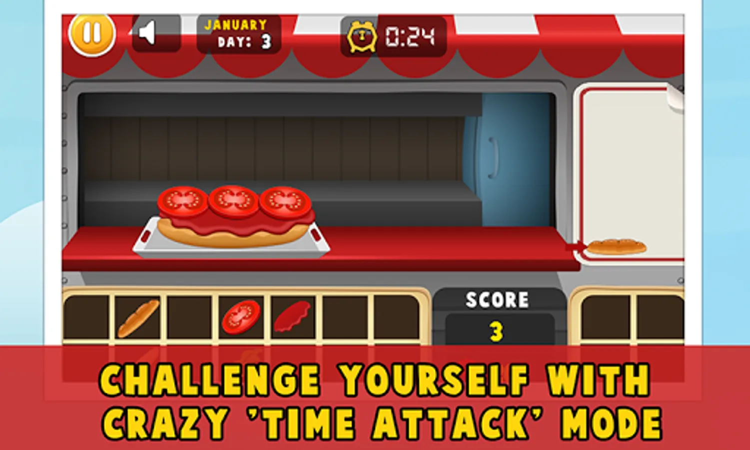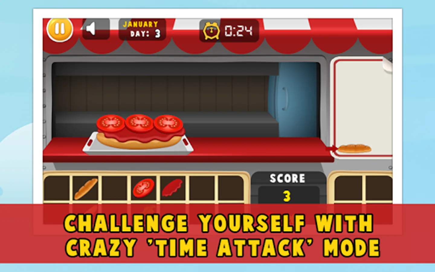✔ In the time attack mode, you can choose 60, 90 or 120 seconds to make as much hamburgers and sandwiches as you can and beat your own highscore!