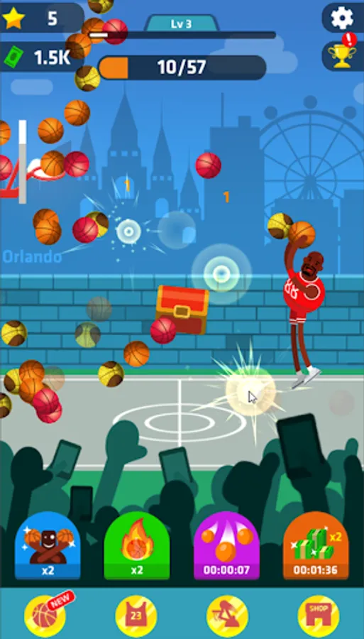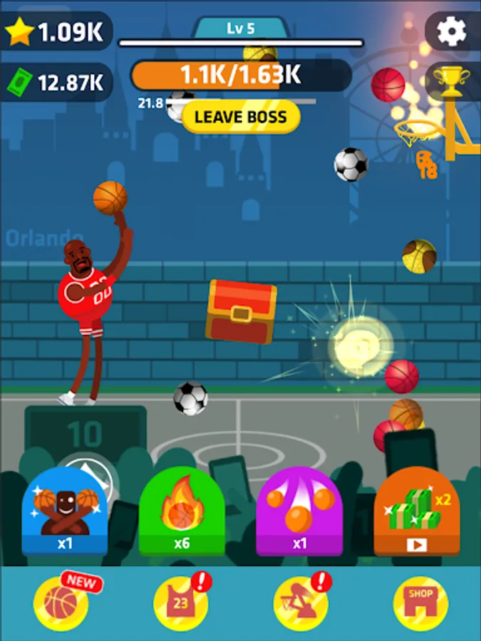Use boosters to enjoy Idle Dunk Masters as idle game: Auto throw, X2 damage, Ball rain, X2 Cash.