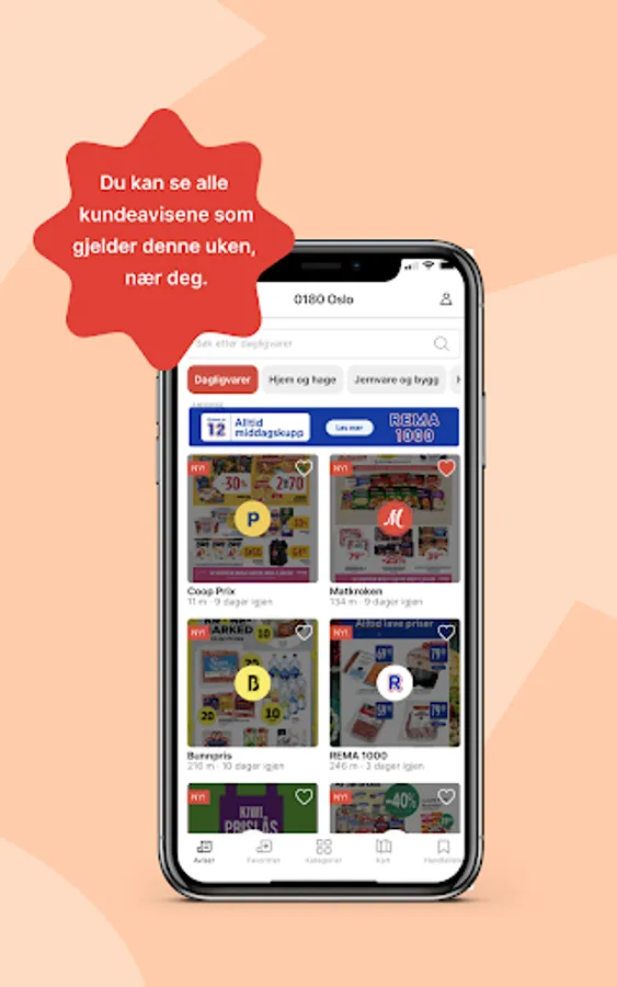 Via the offer app, you can be sure to always find the best offer of the week. With us, you will always find current customer newsletters from most grocery stores in Norway, as well as a number of other stores within furniture, home and garden, hardware, health and well-being, sports and leisure.