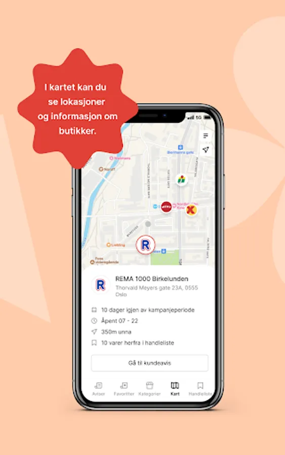 By using your geographic location, we make it easy for you to find the week's offers in the stores closest to you. Here you can see the distance to the shops and have the option to save your favorite shops. The stores are sorted by distance from your location.
