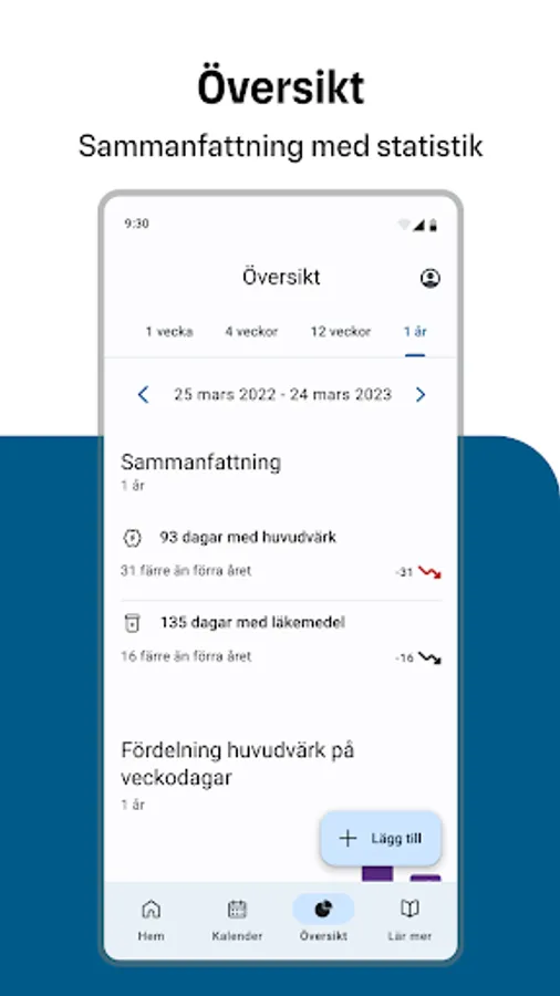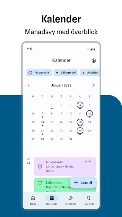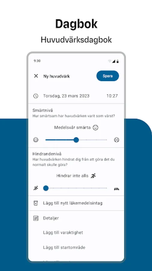 Via a calendar function, you can easily collect information about your headache. It is for you who have migraines or other headaches, regardless of whether you have a diagnosis or not. You get a comprehensive history of your headaches that can serve as a support for yourself to manage your condition. The information can also be used as support in contact with healthcare, which will, among other things, make it easier for healthcare to make a diagnosis, or monitor the effect of a treatment.